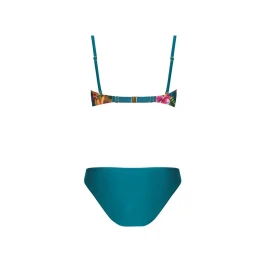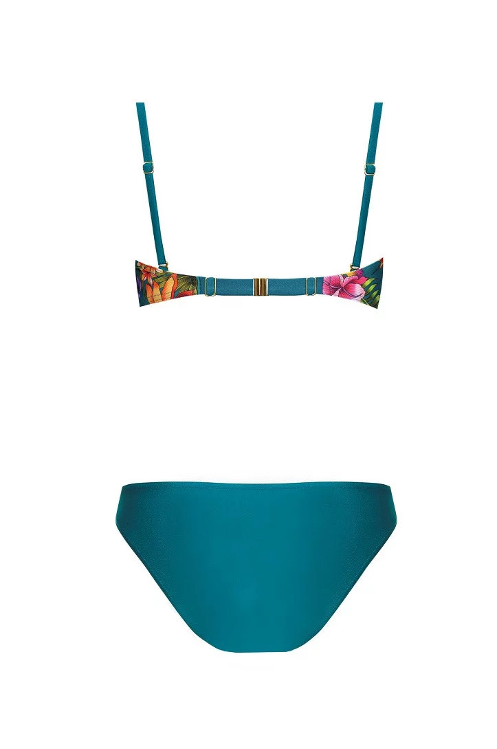 Dámské dvudílné plavky s potiskem exotických květů. Spodní díl klasické kalhotky, vrchní díl vyztužený, odepínací ramínka na posouvání.