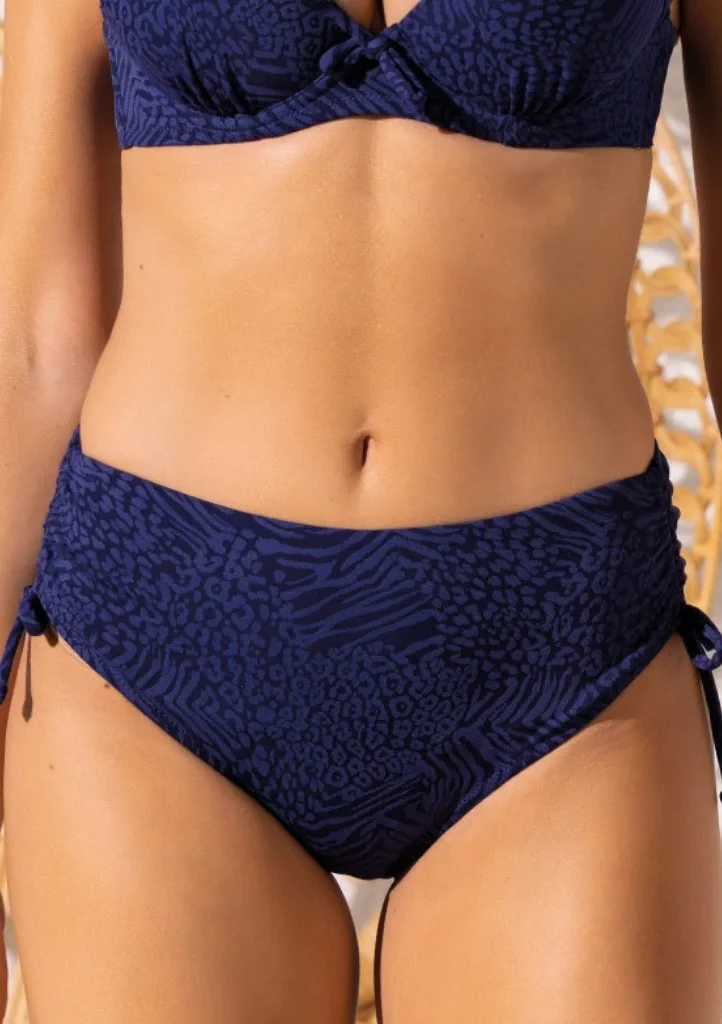 Dámské dvoudílné plavky od značky Sielei. Vrchní díl má košíčky bez kostic s vyjímatelnými výztuhami. Vysokým středem je protažena šňůrka pro regulaci výšky. Vnější stranou košíčků je provlečena šňůrka (a zároveň ramínko) kterou lze regulovat výška košíčků. Širší ramínka jsou pevně všitá, zdobí je kovová aplikace. Obvod je v bocích vyztužen flexibilními kosticemi a ukončen zapínáním na plastovou sponu. Kalhotky jsou klasického střihu, v pase vyšší. V bocích jsou všity šňůrky pro regulaci výšky kalhotek a řasení. V pase a nohavičkách je našita pružná gumička. Spodní i horní díl jsou podšity rychleschnoucí látkou. Prvni obrázek je pro ukázku podprsenky, druhé dva obrázky ukazují střih kalhotek, na posledním obrázku můžete vidět barvu plavek.