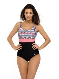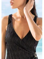 Jednodílné dámské plavky od italské značky Siélei. Plavky mají všitou jemnou podprsenkovou výztuž, která má ve spodní části pružnou gumu. Ramínka mají pevně všitá, nejsou délkově nastavitelná. Vzadu mají hlubší výstřih. Vpředu mají částečné přeložení zužující se směrem do boku s kruhovou aplikací v nejužším místě, plavky tak vizuálně zeštíhlí postavu. Tomu dopomůžou také zlaté svislé proužky a svislé řasení látky. Celé plavky jsou podšity.