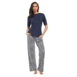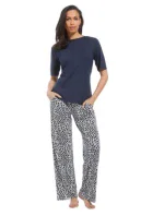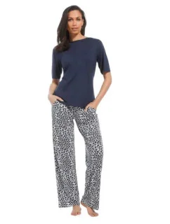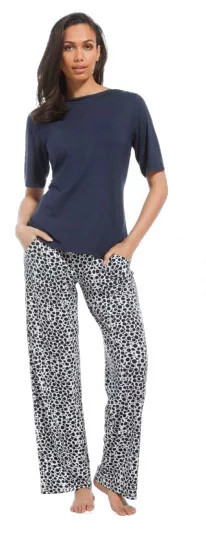 Plážové kalhoty Pastunette s kapsami – elegantní tmavě modré společenské kalhoty, noční kalhoty nebo plážové kalhoty s bílým grafickým potiskem. Možná znáte měkké vlastnosti kvality Bamboo? S viskózou získáte úplně stejné vlastnosti. Fantastický komfort a měkkost, která je příjemná na těle, s fantastickými vlastnostmi pro regulaci teploty a odvodu potu. Měkký žerzej vyrobený z rostlinných a dřevěných vláken