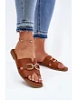 Dámské pantofle vyrobené z eko kůže. Umístěné na plochém podpatku, zajišťují pohodlí při nošení po celý den. Vepředu se nachází jemný zlatý dekorativní detail, který jim dodává jedinečný charakter. Ideální na každodenní nošení, skvěle se hodí k casual outfitům. Při výběru velikosti se řiďte tabulkou velikostí.