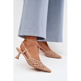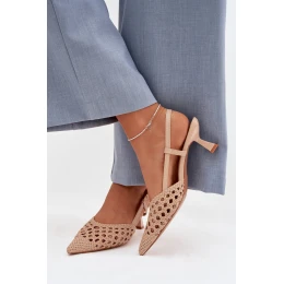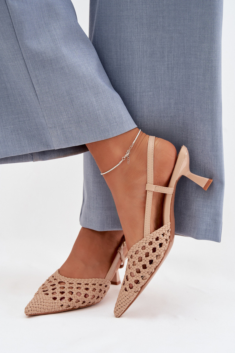 Dámské sandály vyrobené z dekorativního pletení jsou stylovým tipem na teplejší dny. Uzavřené, špičaté nosy zdůrazňují jemnou linii nohy a dodávají obuvi elegantní charakter. Model na tenkém podpatku jemně zeštíhluje siluetu, zajišťujíc ženský vzhled. Zapínání na přezku umožňuje přizpůsobení noze, zvyšuje pohodlí a stabilitu při chůzi. Tyto elegantní sandály skvěle doplní letní outfity – jak na každodenní nošení, tak na výjimečné příležitosti. Při výběru velikosti se řiďte tabulkou velikostí.