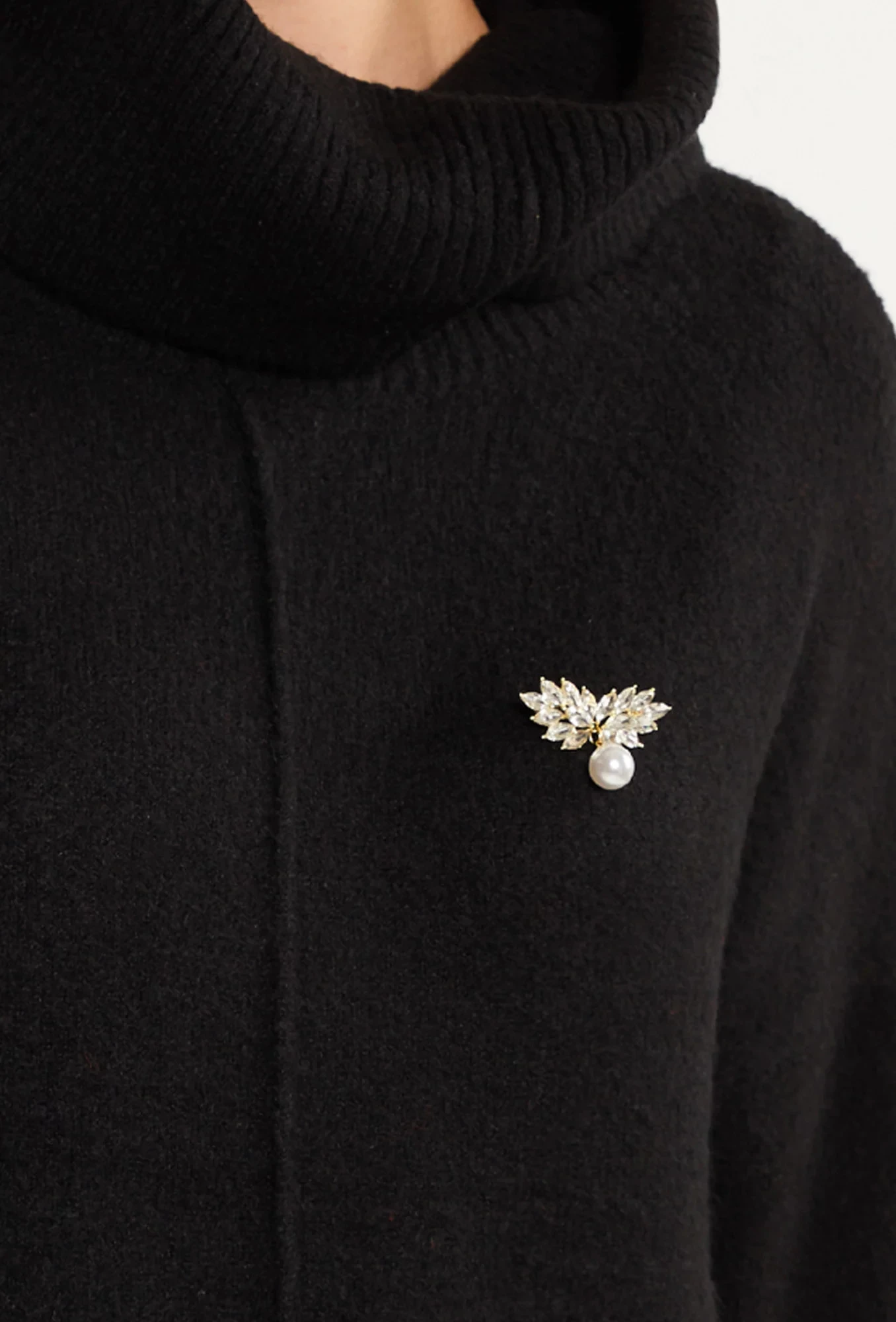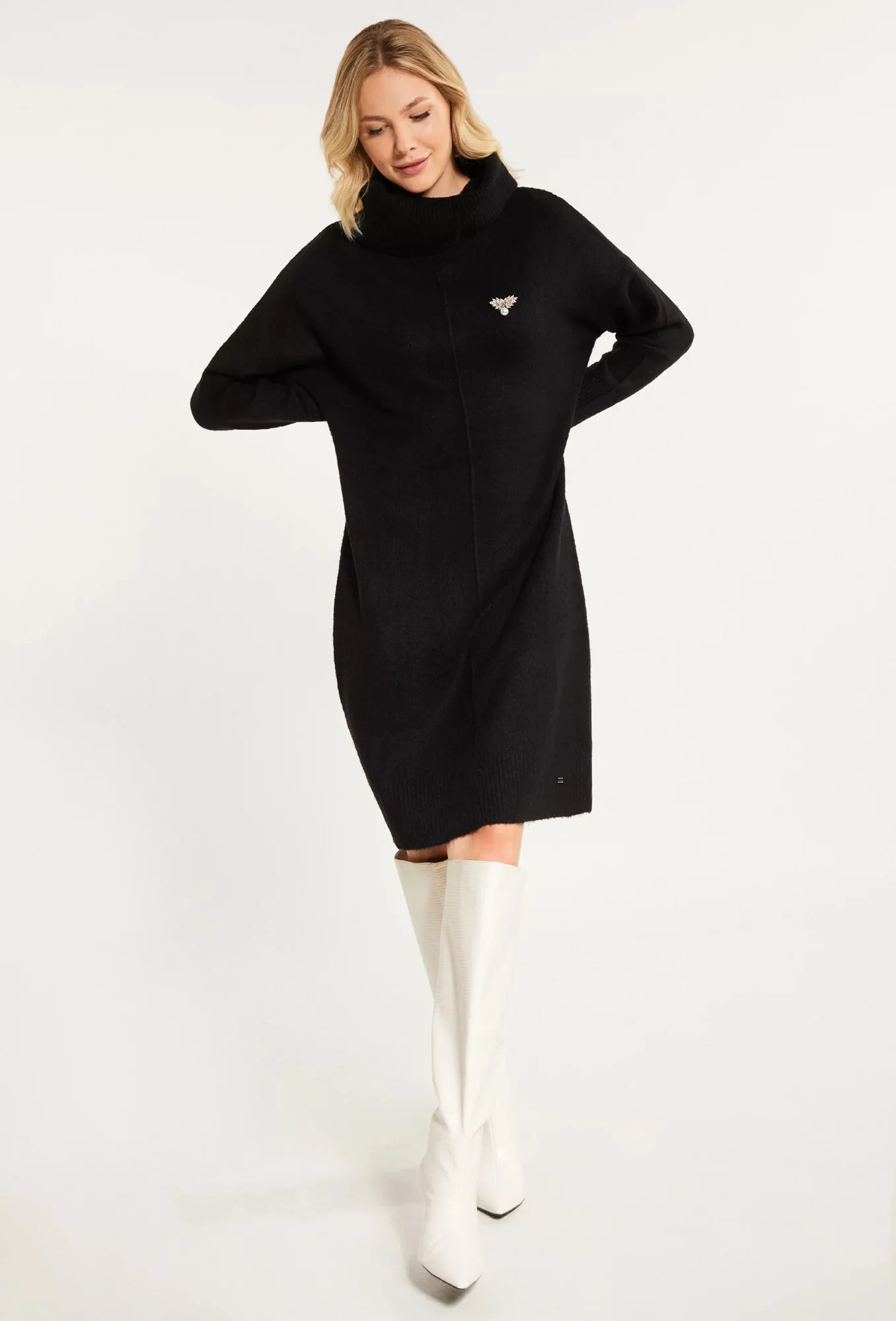 Dámské svetrové šaty se šperkovou broží. Šaty s dlouhými rukávy a vysokým límcem. Šaty v délce midi. Tento model je ideální pro chladné podzimní dny. Model na obrázku je vysoký 177 cm a má velikost 36.