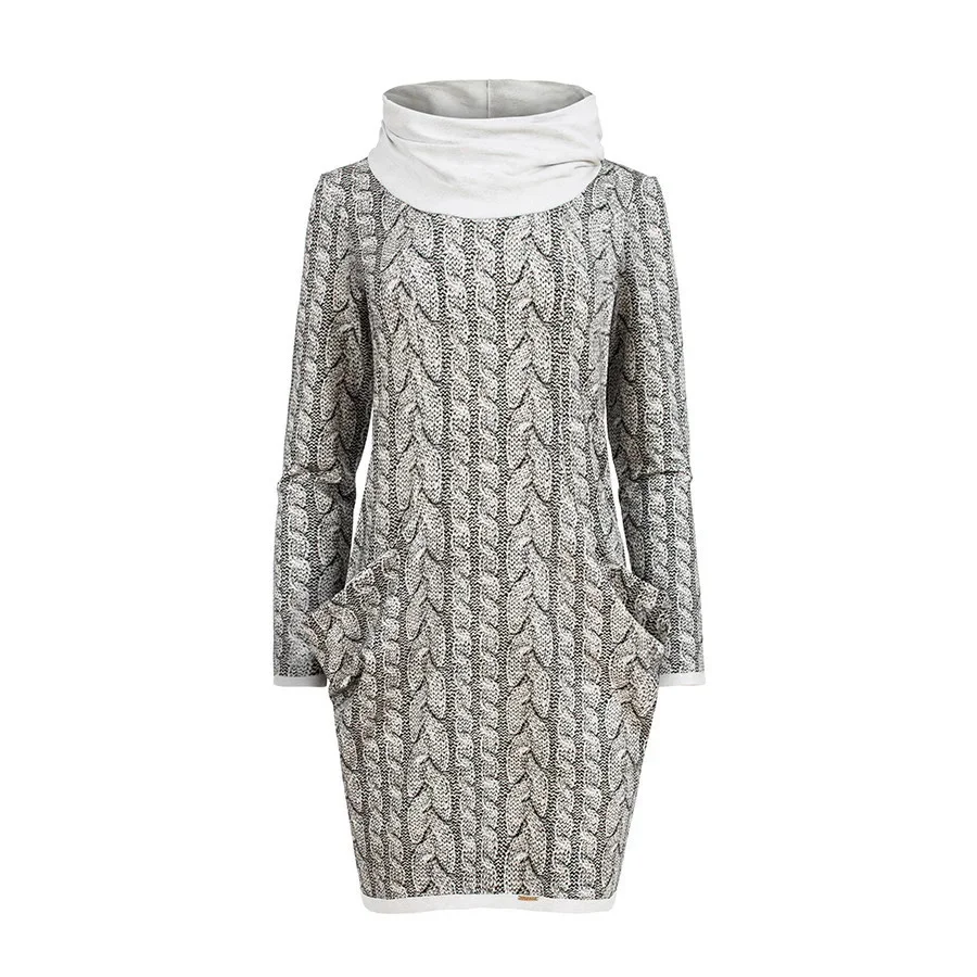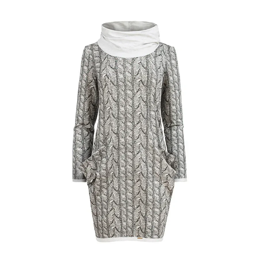 Dámské šaty s rolákem a kapsami na bocích. Jsou ušité z kvalitního materiálu se svetrovým vzorem.