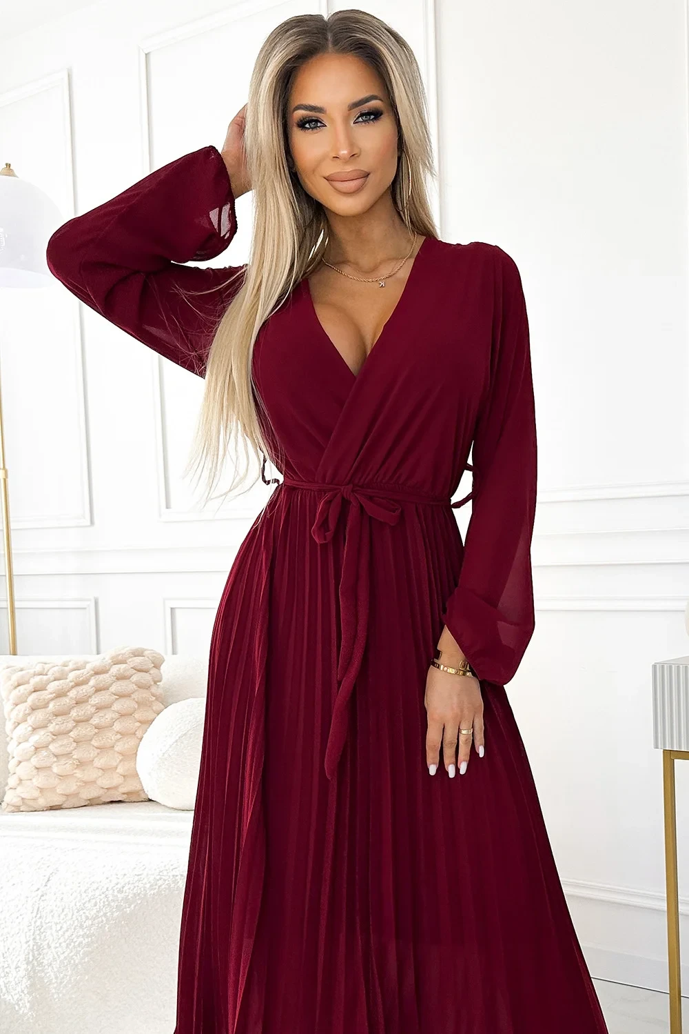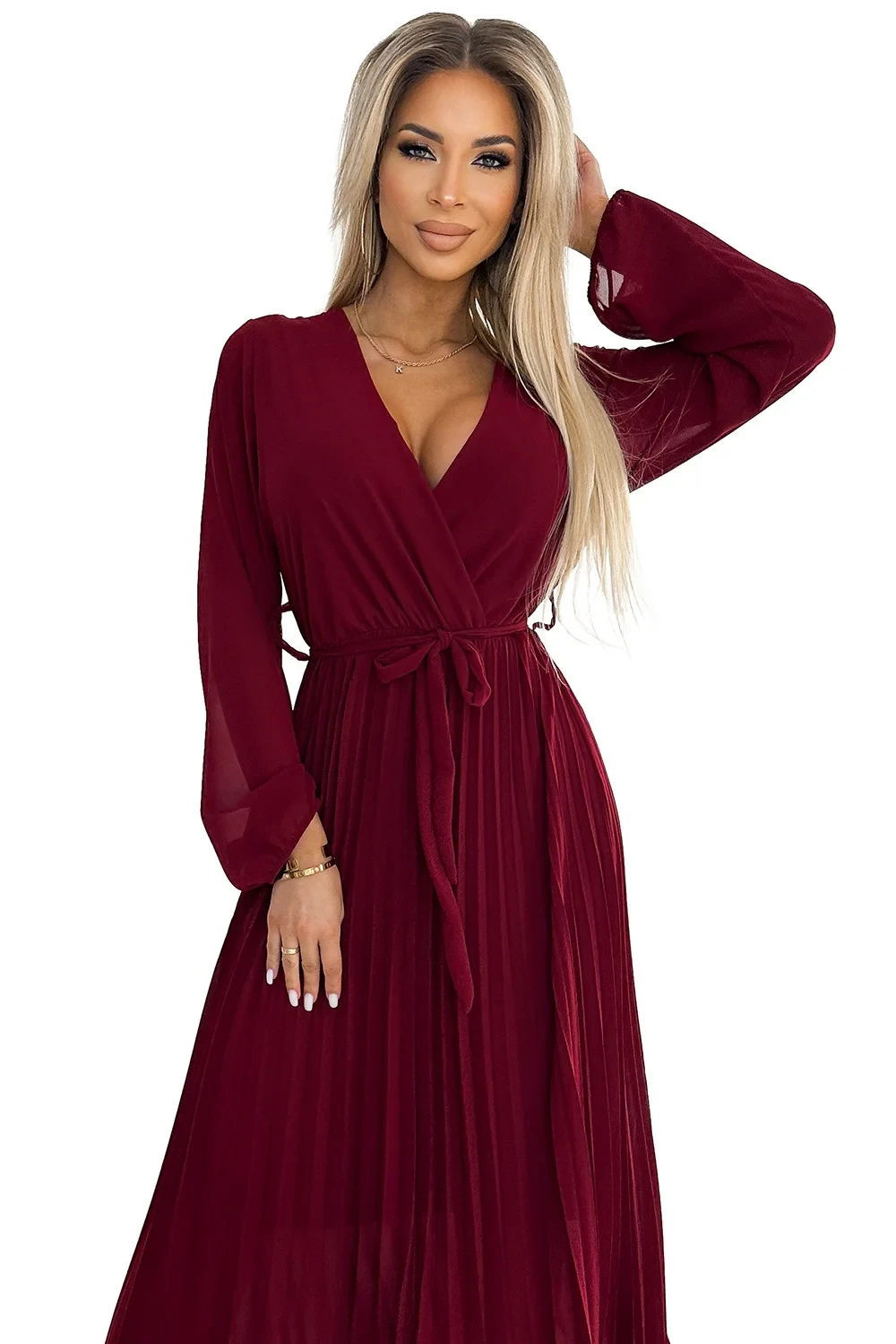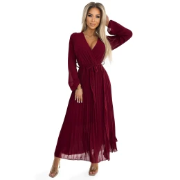 Dámské plisované šifonové šaty ve vínové barvě s výstřihem, dlouhými rukávy a páskem pro zavazování model 21310318 - numoco basic