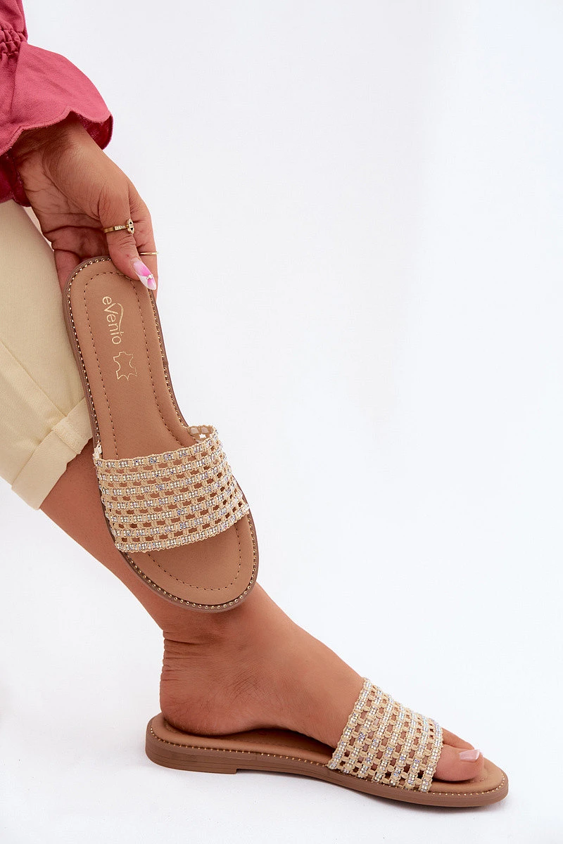 Dámské ploché nazouváky s lesklými ozdobami jsou stylovým návrhem, který kombinuje pohodlí s elegantním akcentem. Jemný lesk imitace zirkonií přitahuje pohledy a dodává celku výjimečný charakter. Plochá konstrukce činí tento model ideálním na každodenní nošení, zajišťujícím pohodlí při nošení. Kožená vložka zvyšuje komfort a činí nazouváky příjemnými pro nohy i po delší dobu. Ideální volba na letní výlety, procházky nebo setkání, kdy chcete vypadat stylově a cítit se volně. Při výběru velikosti se řiďte tabulkou velikostí.