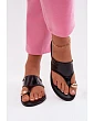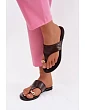 Elegantní dámské žabky z eko kůže jsou stylovou volbou na letní dny. Plochá podrážka zajišťuje pohodlí při každodenním nošení a zlatý detail na prstu dodává celku jemný, elegantní charakter. Jednoduchý, nadčasový střih umožňuje skvěle kombinovat s různými letními outfity. Při výběru velikosti se řiďte tabulkou velikostí.