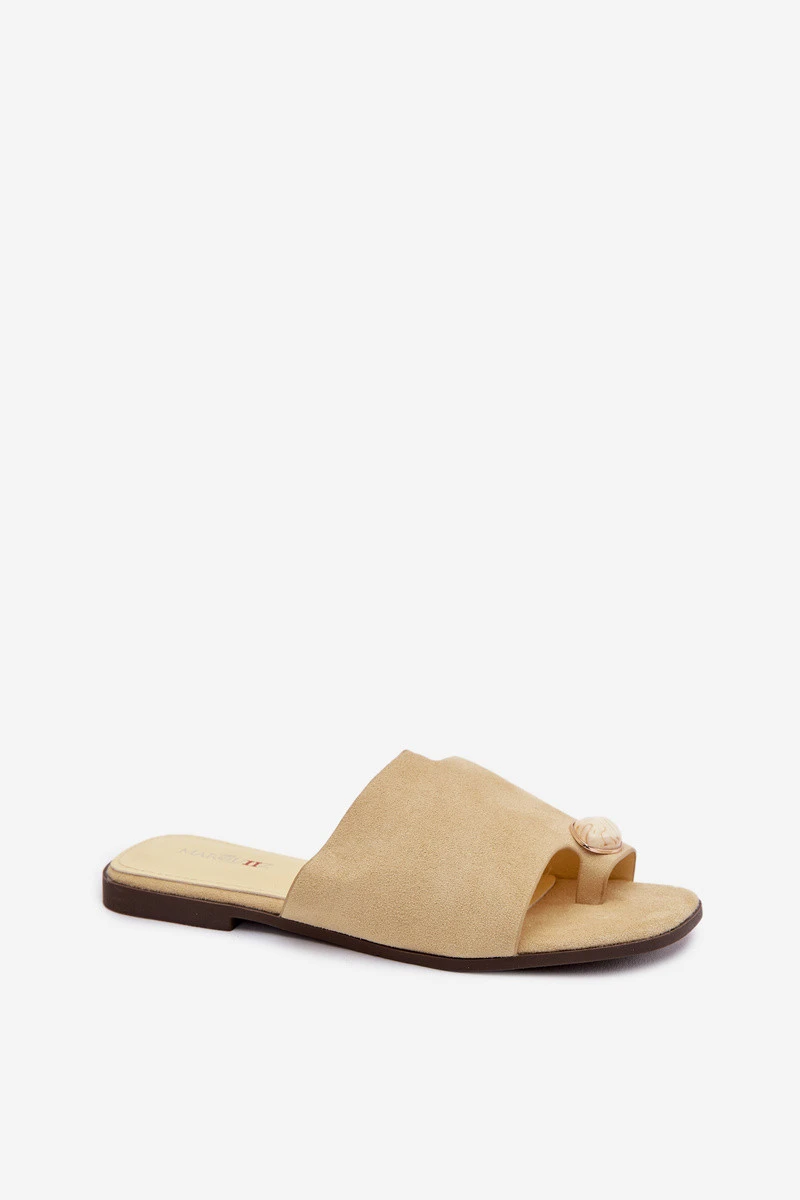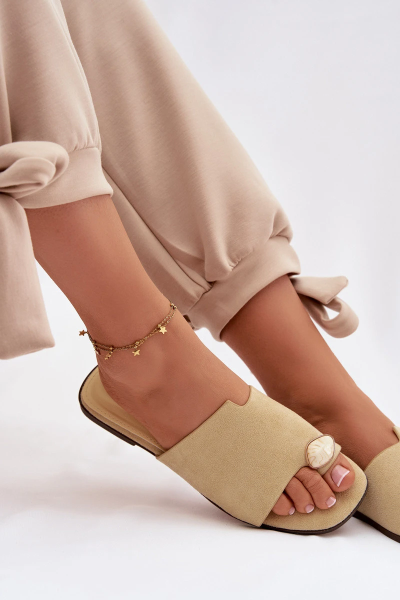 Dámské ploché pantofle z eko semiše jsou stylovým a pohodlným tipem na horké dny. Měkký materiál zajišťuje komfort nošení a ozdobný detail umístěný vpředu dodává celku jemný, ženský charakter. Jednoduchý, plochý střih činí tyto pantofle ideální jak pro každodenní outfity, tak jako elegantní doplněk letních setů. Při výběru velikosti se řiďte tabulkou velikostí.
