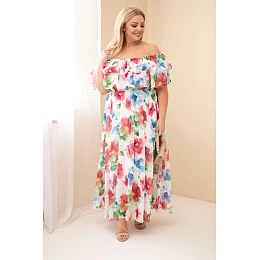 Efektní dámské šaty Plus Size v hispánském stylu jsou vynikající volbou pro ženy, které si přejí spojit pohodlí s módním vzhledem. Model okouzluje krásným květinovým vzorem a širokým volánem u výstřihu, který jemně odhaluje ramena a dodává celku výjimečnou lehkost. Vzdušný střih způsobuje, že se šaty volně přizpůsobují postavě, zajišťují komfort nošení a maskují drobné nedostatky figury.