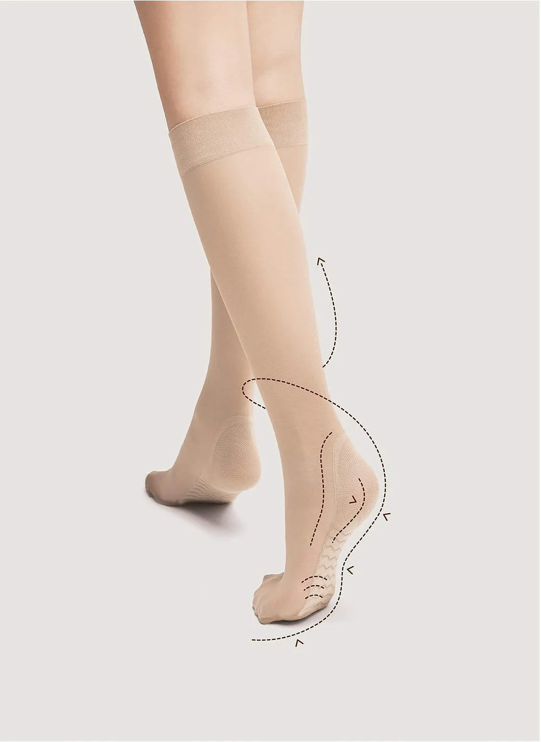 Dámské podkolenky s preventivním efektem masáže chodidel a s lemem, který netlačí.