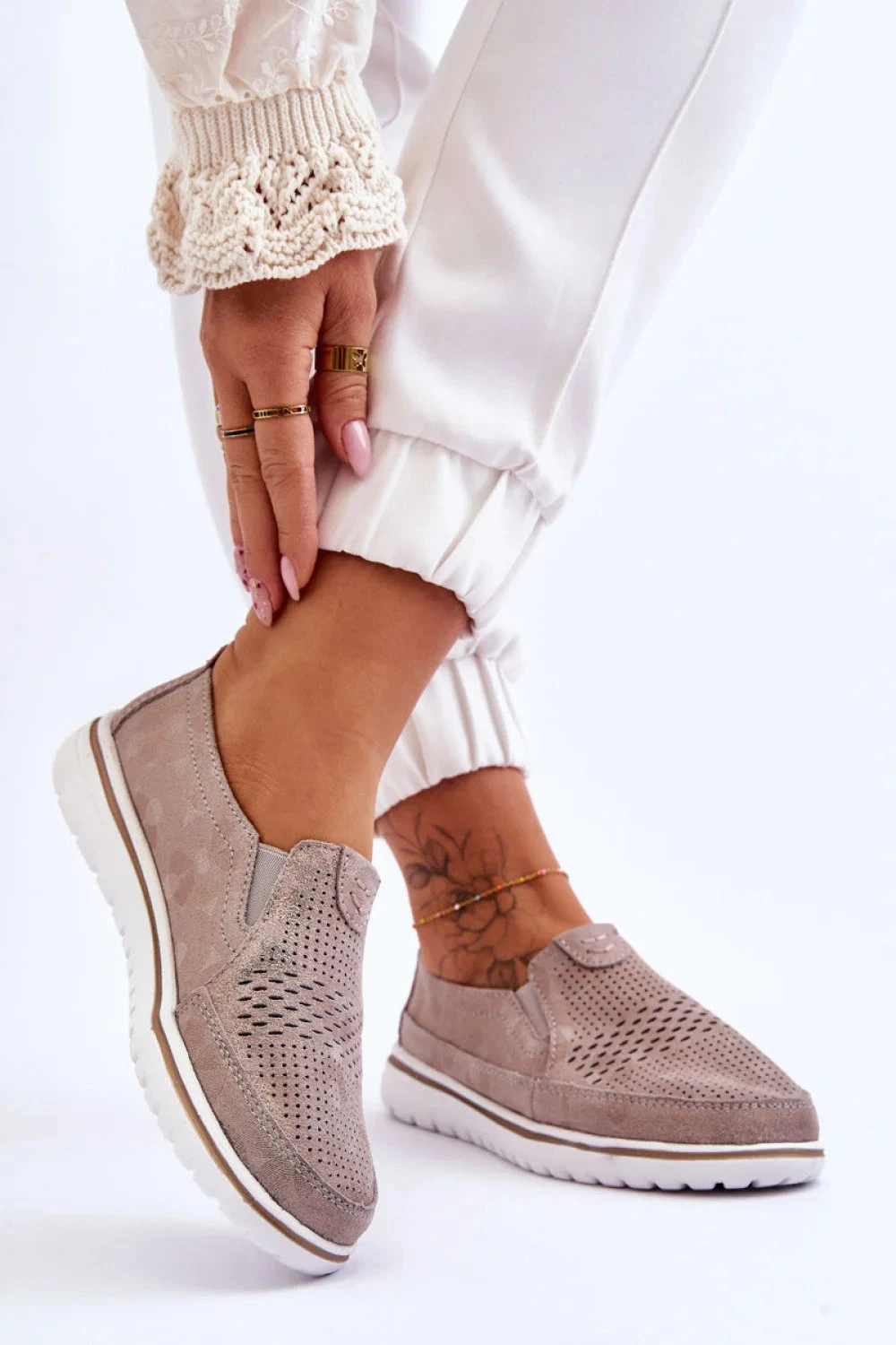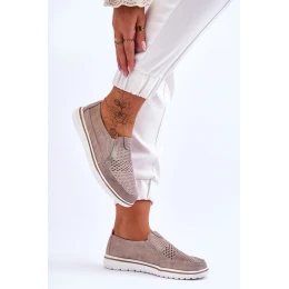 Dámské polobotky byly vyrobeny z přírodní kůže s ažurovým vzorem na přední straně. Tento model má gumičky umožňující správné přizpůsobení obuvi šířce nohy. Umístěné na platformě. Tento model je mimořádně lehký a pohodlný při nošení. Stélka je také vyrobena z přírodní kůže.