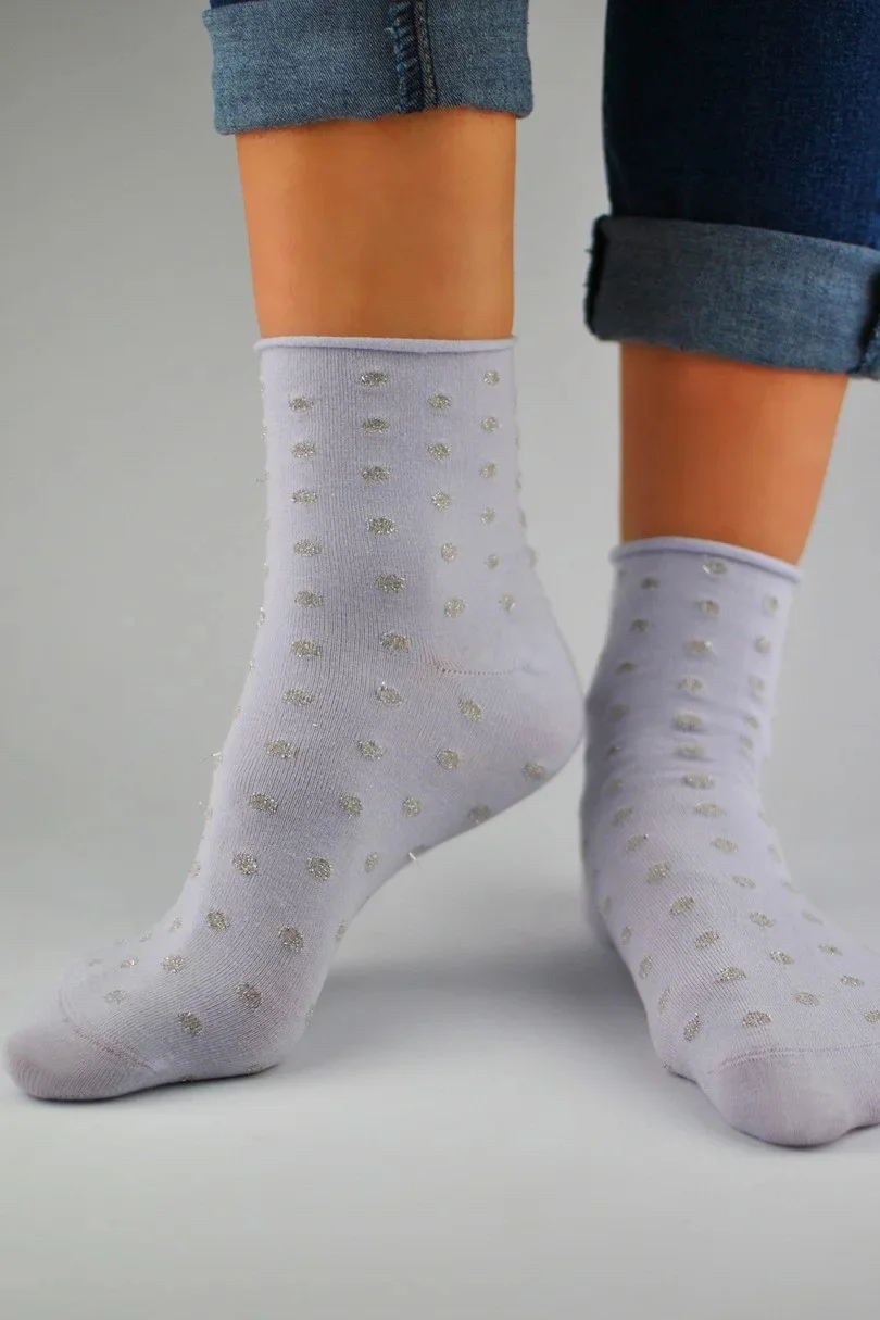 Dámské ponožky bez lurexu. Složení surovin: 80% bavlna, 17% polyamid, 1% elastan, 2% metalizovaná příze.