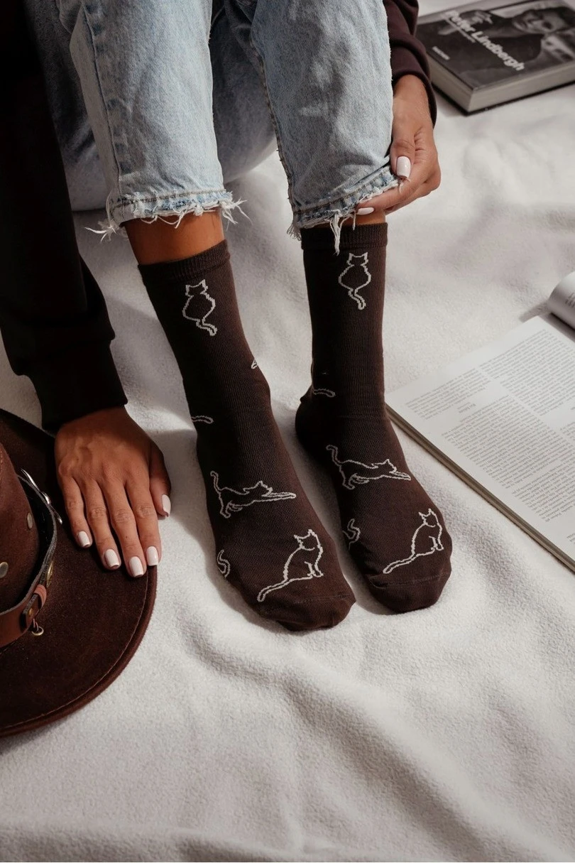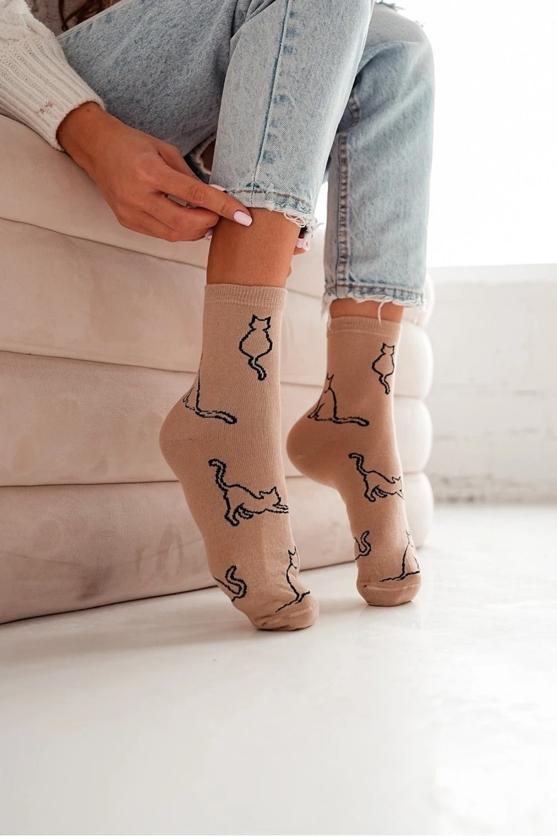 Model wyróżnia się subtelnym, ale stylowym wzorem z konturami kota – idealny dla miłośniczek zwierząt i nietuzinkowych dodatków. Świetnie komponują się z codziennym strojem, nadając mu lekko humorystycznego, ale eleganckiego charakteru.