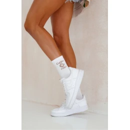 Bílé dámské ponožky s nápisem Coffee FIRST jsou pohodlné, měkké a ideální pro každodenní nošení. Díky kvalitnímu materiálu poskytují příjemný pocit po celý den a dobrou prodyšnost. Stylový nápis dodává ponožkám moderní vzhled a potěší každou milovnici kávy.
