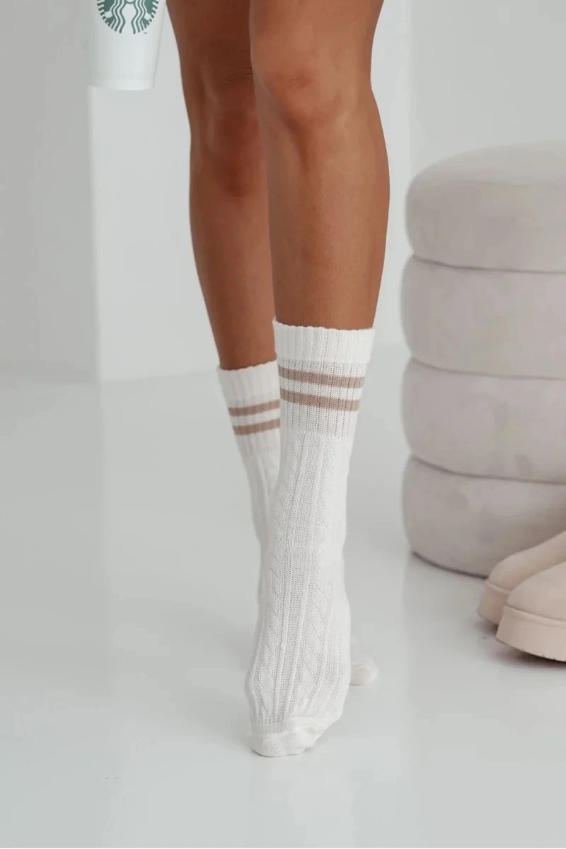 Stylové dámské ponožky v ecru odstínu s copánkovým vzorem a jemnými pruhy. Měkký a elastický materiál zajišťuje pohodlí a prodyšnost, vhodné pro každodenní nošení doma i venku.