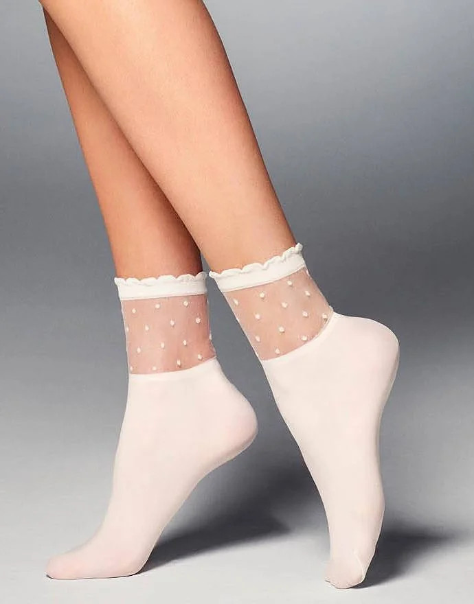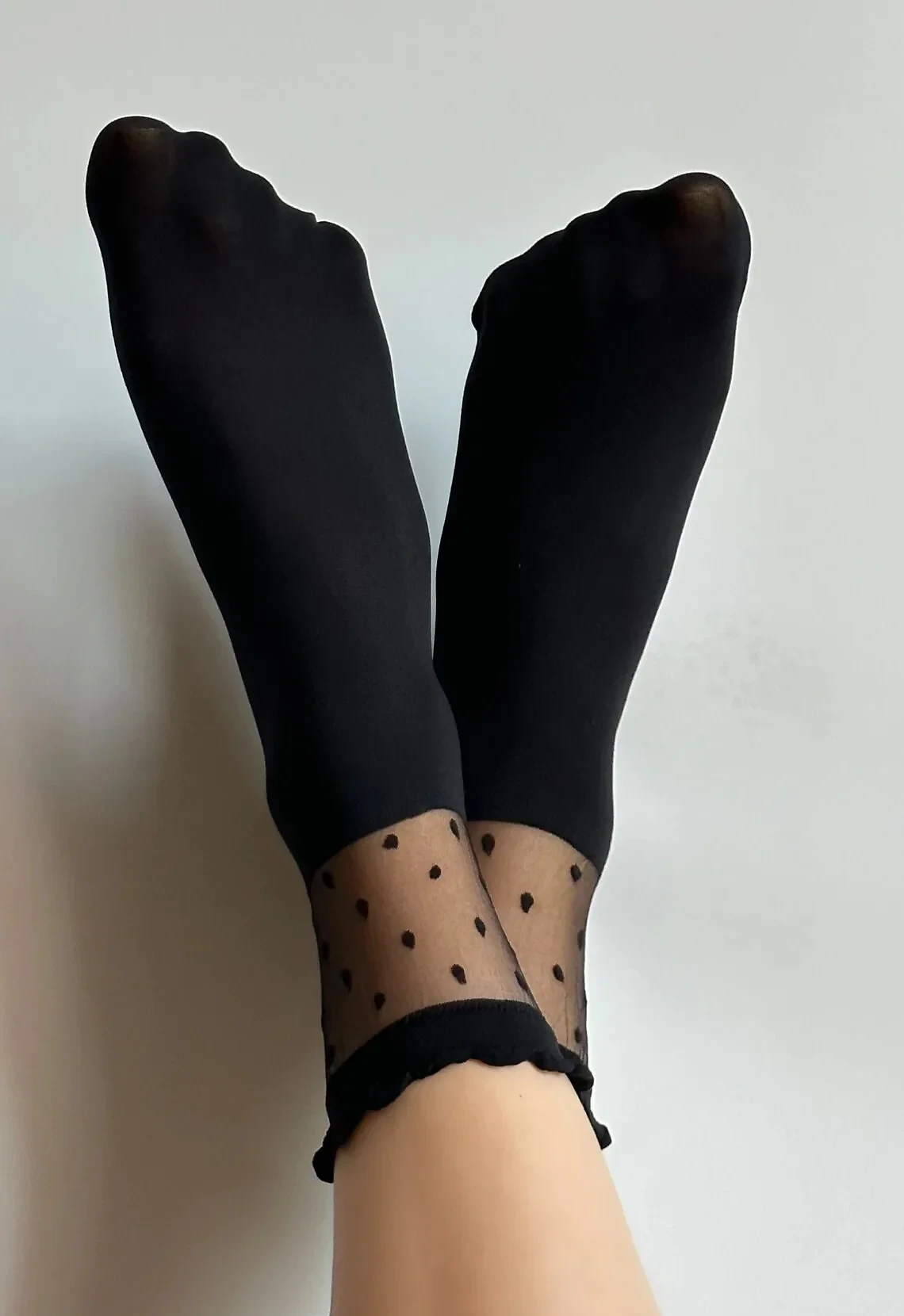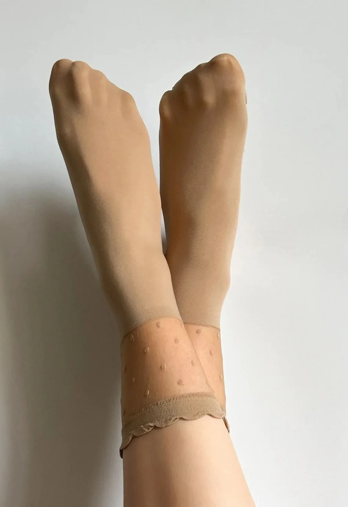 Ponožky z mikrovlákna, v horní linii z tenké lycry zdobené jemným vzorem s tečkami, s netlačícím, ozdobným lemem.