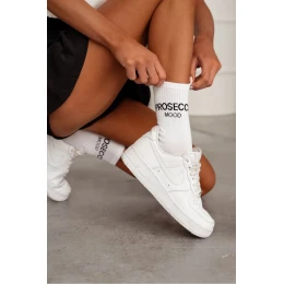 Bílé dámské ponožky PROSECCO MOOD jsou měkké, pohodlné a ideální pro každodenní nošení. Kvalitní materiál zajišťuje příjemný pocit po celý den a dobrou prodyšnost. Moderní nápis a design dodávají ponožkám stylový a originální vzhled.