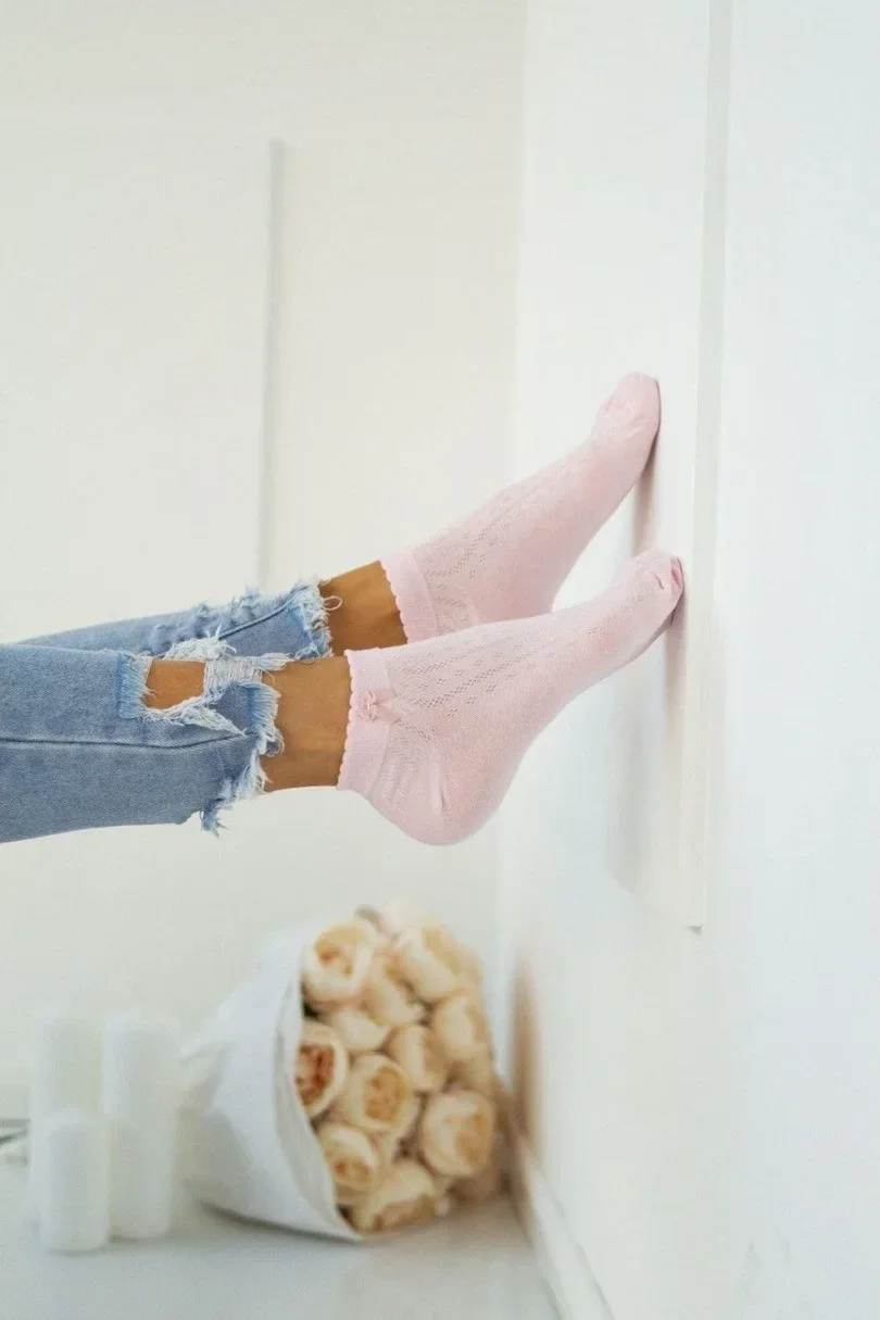 Dámské ponožky těsné ponožky s mašlí na kotníku jsou kombinací elegance a pohodlí. Jsou vyrobeny z vysoce kvalitní bavlny a zajišťují prodyšnost a pohodlí po celý den. Jemný prolamovaný vzor dodává ponožkám jemnost a lehkost a půvabná mašle na kotníku podtrhuje jejich ženský charakter. Jsou ideální jak pro každodenní nošení, tak pro elegantnější outfity. Jejich elastická konstrukce zaručuje dokonalé přilnutí k noze, aniž by způsobovaly tlak.