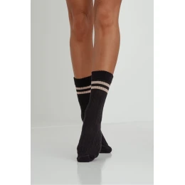 Stylové dámské ponožky v elegantní černé barvě, zdobené výrazným copánkovým vzorem a jemnými pruhy. Jsou měkké, příjemné k pokožce a ideální pro celodenní pohodlí i chladnější dny.