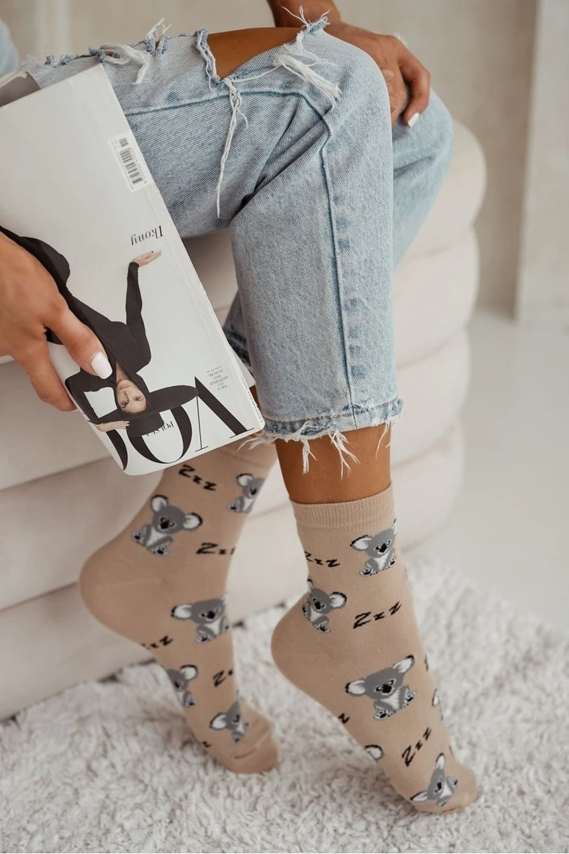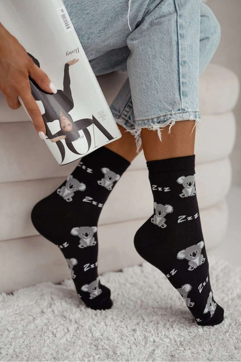 Dámské ponožky Sleeping Koalas jsou ideální volbou pro milovníky pohodlí a originálních designů. Roztomilý motiv koaly jim dodává jedinečný charakter a syté barvy vnesou do každodenního stylingu trochu zábavy. Jsou vyrobeny z kvalitní bavlny s přídavkem polyamidu a elastanu, jsou měkké, prodyšné a dokonale se přizpůsobí noze. Ideální pro každodenní – práci, školu nebo domácí relaxaci.