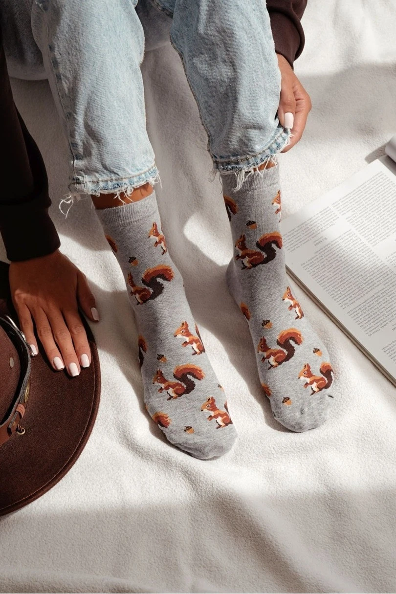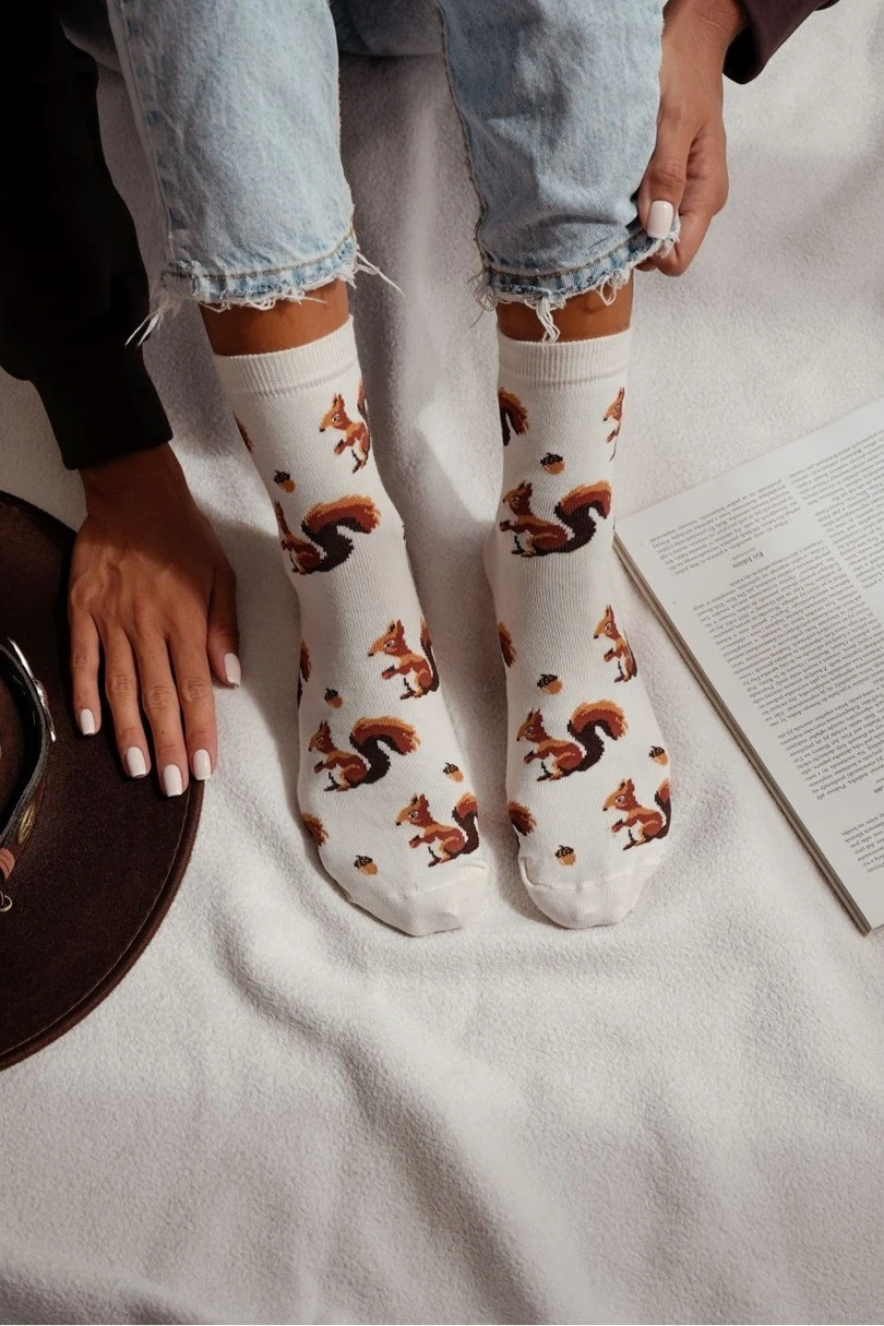 Dodaj uroku swoim codziennym stylizacjom dzięki damskim skarpetkom MILENA Wiewiórka i orzechy 0200.185! Ten uroczy model z nadrukiem wiewiórek i orzeszków przyciąga uwagę i wywołuje uśmiech. Wysoka zawartość naturalnej bawełny zapewnia miękkość i przewiewność, a domieszka elastanu i poliamidu gwarantuje idealne dopasowanie i trwałość. To doskonały wybór na co dzień – zarówno do domu, jak i do pracy czy szkoły. Damskie skarpetki MILENA to połączenie komfortu, jakości i oryginalnego designu.