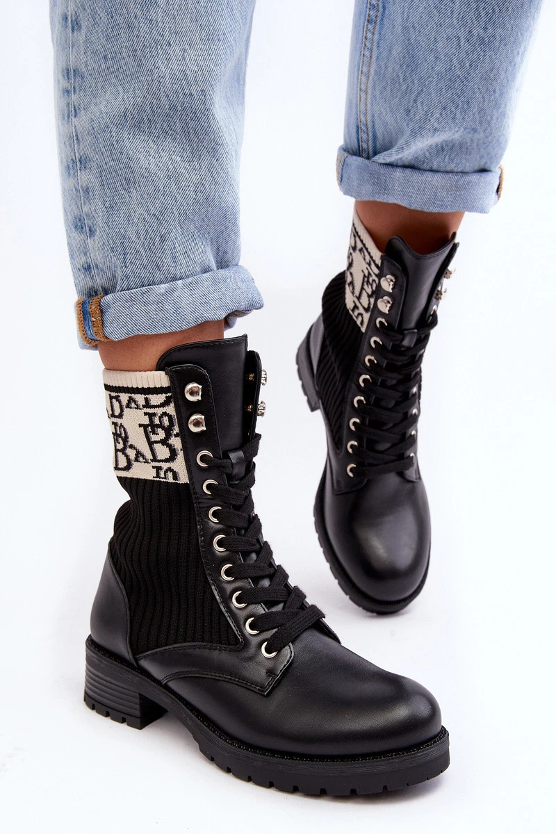 Módní dámské boty vyrobené z kombinace eko kůže a látky. Osazené na plochém podpatku a platformě. Model šněrování. Horní část ve formě ponožky. Špička je zaoblená. Špička na tomto obuvi je zesílená. Ideální pro podzimní stylizace! Při výběru velikosti se řiďte tabulkou velikostí.