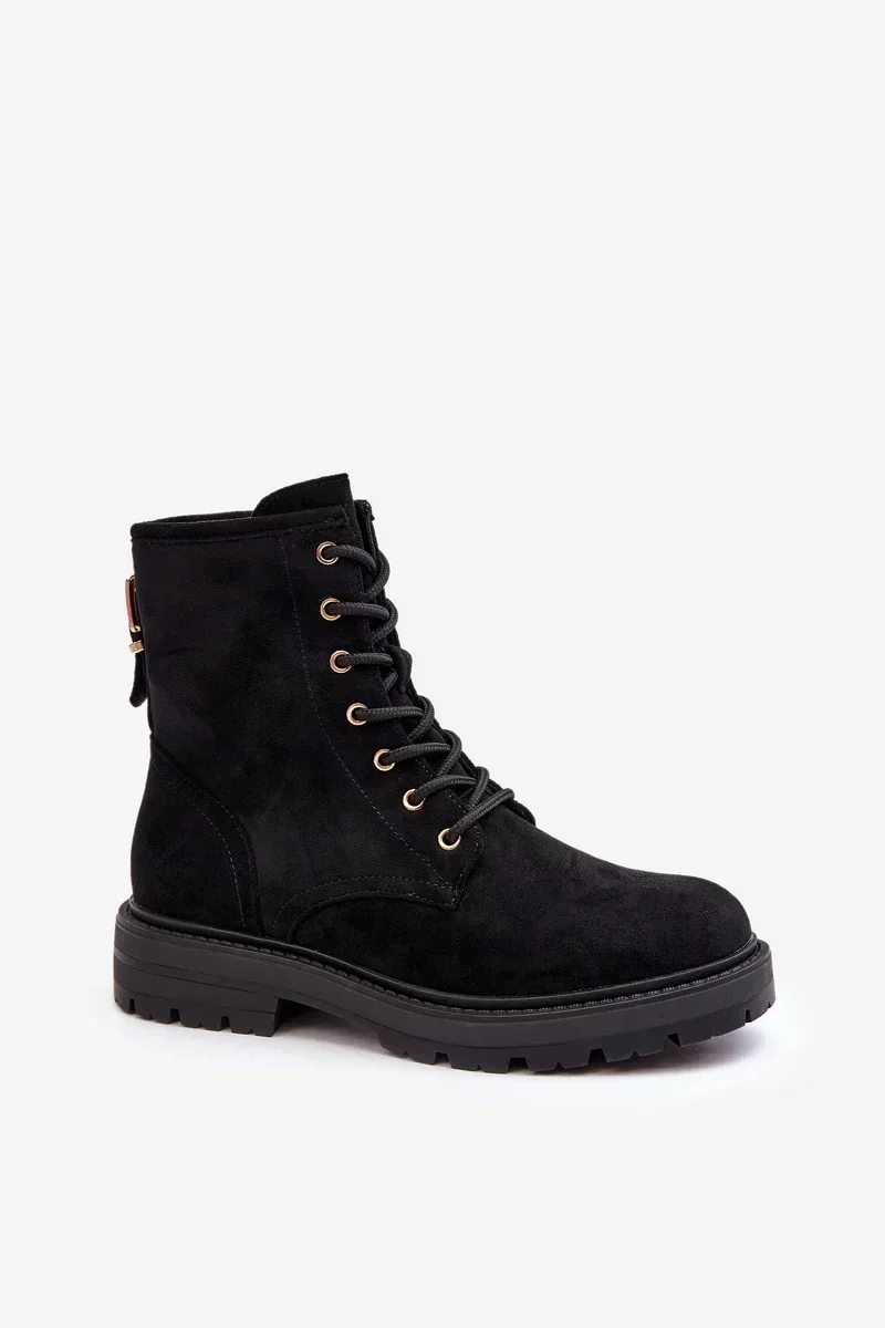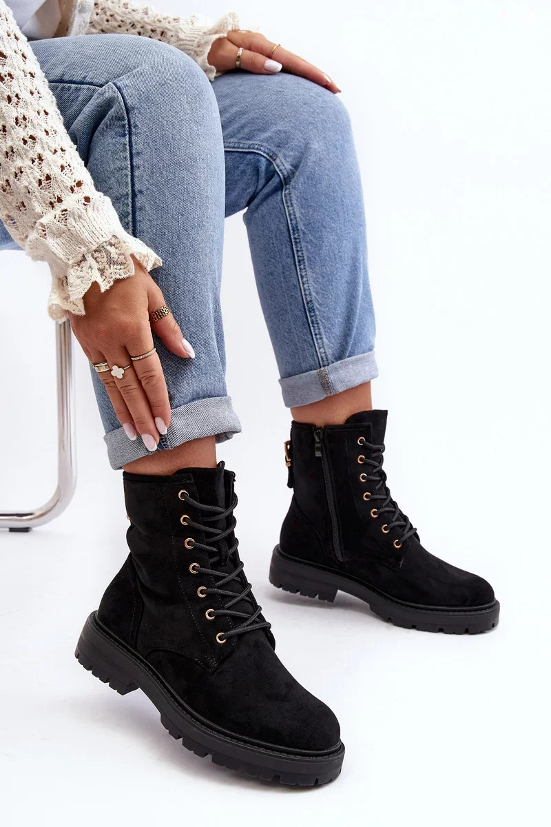 Klasické dámské kotníkové boty vyrobené z eko semiše. Nasazené na platformě a plochém podpatku. Tento model se zapíná na zip a má navíc šněrování. Zaoblené prsty. Vyztužená pata umožňuje správnou stabilizaci chodidla. Na zadní straně svršku je krátký pásek s přezkou. Rozhodně byste je měli mít! Při výběru velikosti se řiďte tabulkou velikostí.