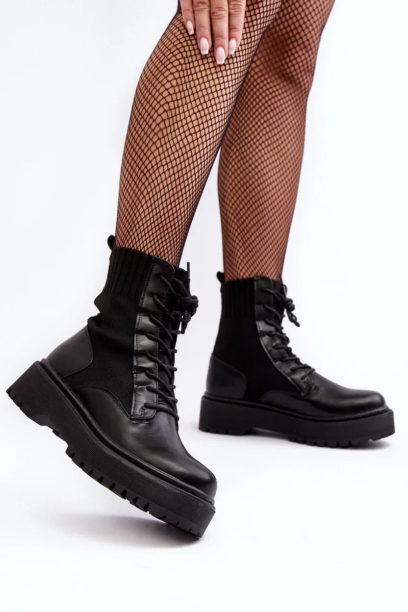 Dámské kotníkové boty z kombinace eko kůže a textilního materiálu. Svršek kotníku. Model na šněrování. Nasazené na plochém podpatku a masivní platformě. Zaoblené prsty. Vyztužená pata. Klasický model, který se bude hodit k mnoha podzimním stylům! Při výběru velikosti se řiďte tabulkou velikostí.