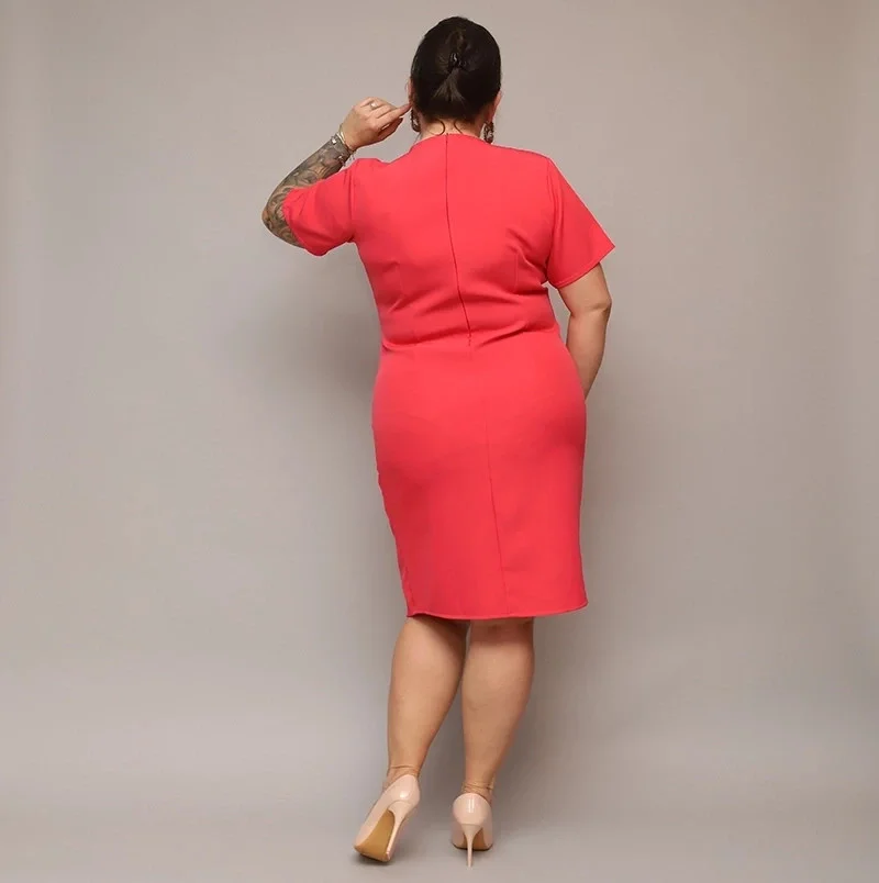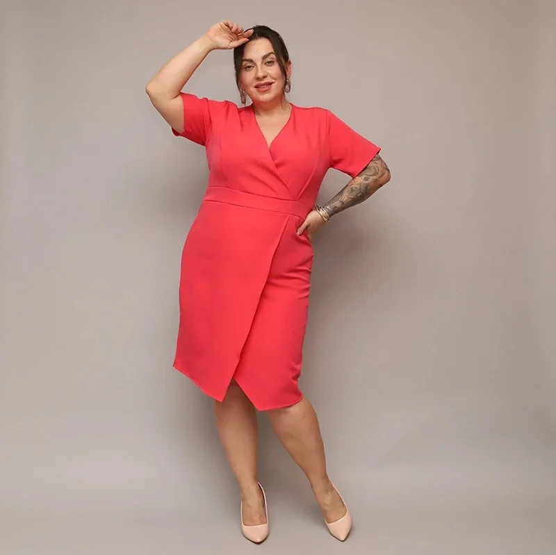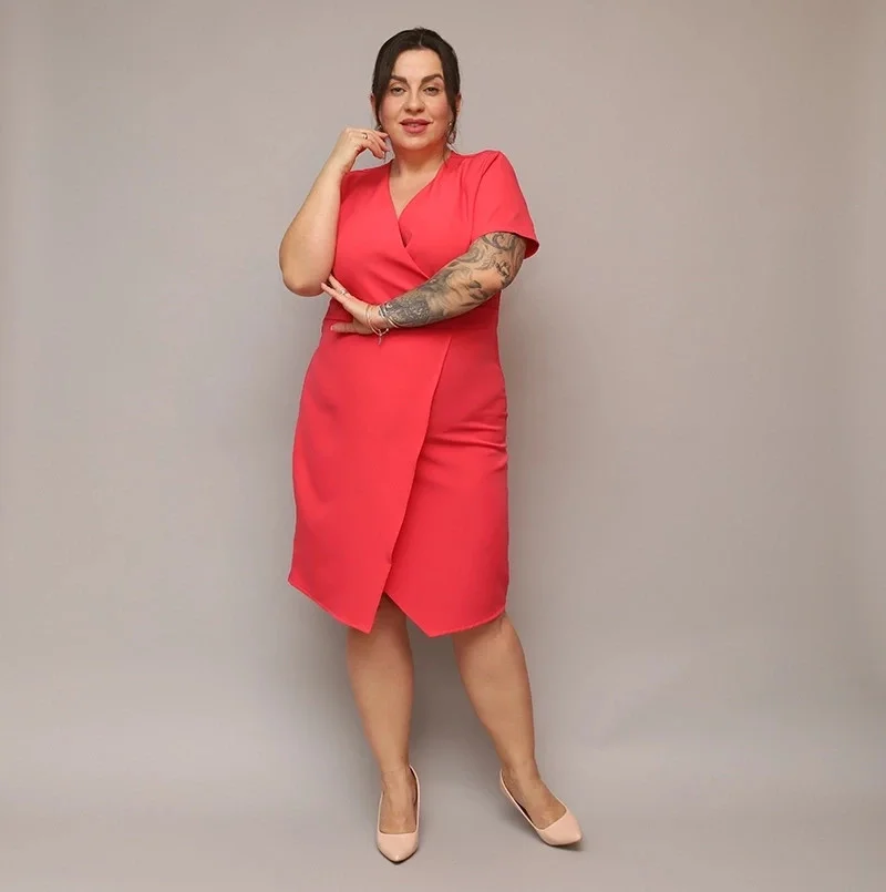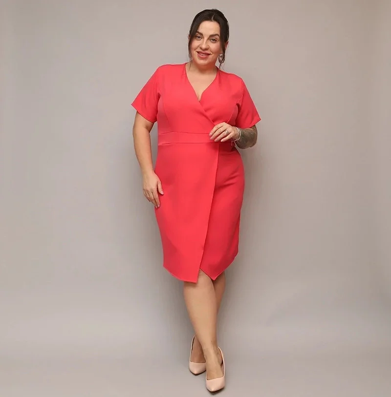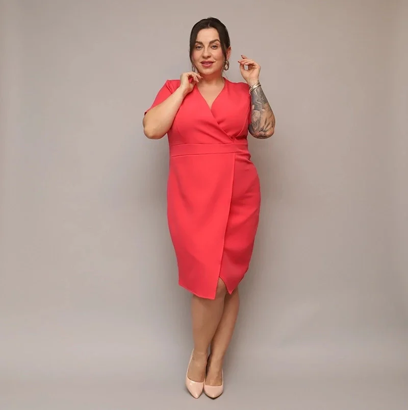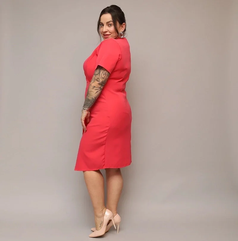 Dámské přeložené obálkové šaty v korálové barvě v délce ke kolenům (743)