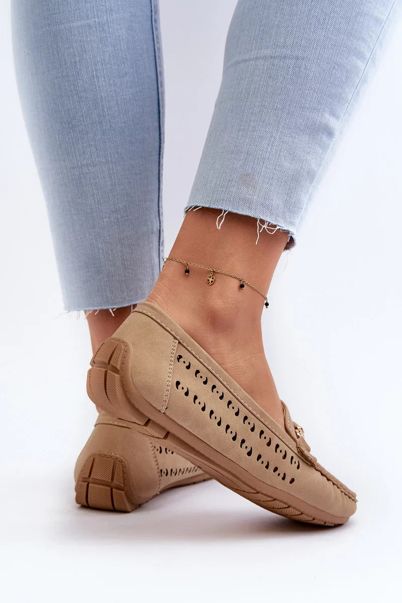 Dámské prolamované mokasíny z eko kůže. Zlaté zdobení na přední straně jim dodává jedinečný charakter. Měkká stélka zajišťuje pohodlí při používání. Tyto mokasíny, ideální pro mnoho různých příležitostí, udělají váš outfit jedinečným a stylovým. Při výběru velikosti se řiďte tabulkou velikostí.