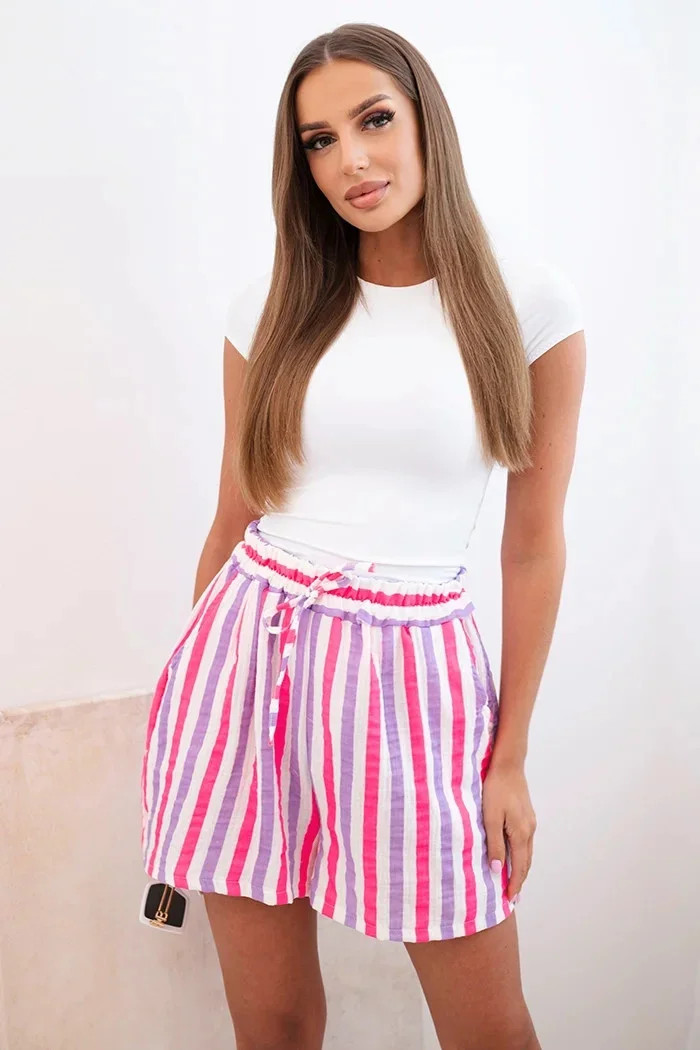 Dámské letní šortky s barevnými pruhy jsou ideální volbou pro teplé dny. Vyrobené z prodyšné 100% bavlny zaručují maximální pohodlí při nošení – bez ohledu na příležitost. Vysoký pas s elastickou gumou a ozdobným zavazováním v pase zajišťuje dokonalé přizpůsobení, volný střih neomezuje pohyb a dodává lehkost a volnost. Model se skvěle hodí jak na dovolenou, tak na každodenní procházky nebo setkání s přáteli. Intenzivní barvy a svislé pruhy opticky zeštíhlují postavu a boční kapsy zvyšují praktičnost. Je to must-have v letním šatníku každé ženy! Velikost je univerzální a hodí se pro ženy velikosti S, M nebo L.