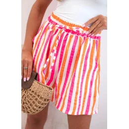 Dámské letní šortky s barevnými pruhy jsou ideální volbou pro teplé dny. Vyrobené z prodyšné 100% bavlny zaručují maximální pohodlí při nošení – bez ohledu na příležitost. Vysoký pas s elastickou gumou a ozdobným zavazováním v pase zajišťuje dokonalé přizpůsobení, volný střih neomezuje pohyb a dodává lehkost a volnost. Model se skvěle hodí jak na dovolenou, tak na každodenní procházky nebo setkání s přáteli. Intenzivní barvy a svislé pruhy opticky zeštíhlují postavu a boční kapsy zvyšují praktičnost. Je to must-have v letním šatníku každé ženy! Velikost je univerzální a hodí se pro ženy velikosti S, M nebo L.