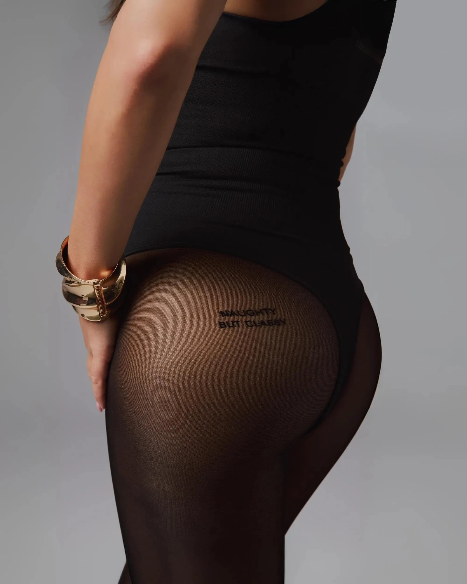 - ozdobný nápis „naughty but classy“ na zadní straně