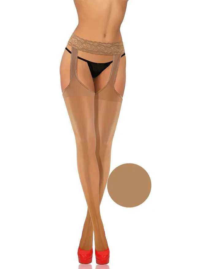Model smyslně spojuje punčocháče a punčochy k podvazkovému pásu. Pas modelu je vyrobený z krajky se silikonem. Punčocháče jsou matné a průhledné. Špičky nejsou zesílené.