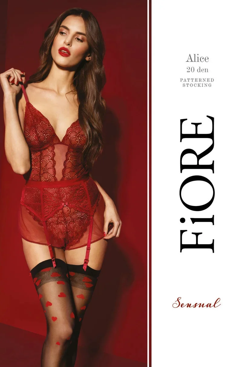 Smyslné, vzorované punčochy k podvazkovému pasu, zdobené červenou aplikací ve tvaru srdíček. Bez vyznačených prstů. Ušité oplétanou technologií, která zvyšuje kvalitu a odolnost výrobku.