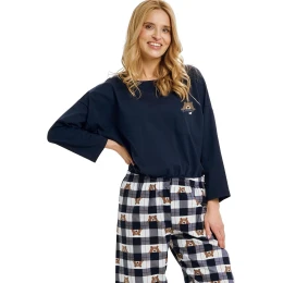 Dámské pyžamo 3441 01 Astrid TARO - z vysoce jakostní bavlny - tmavě modré tričko s dlouhými rukávy - kulatý výstřih - zdobené potiskem na přední straně - dlouhé volné nohavice s potiskem
