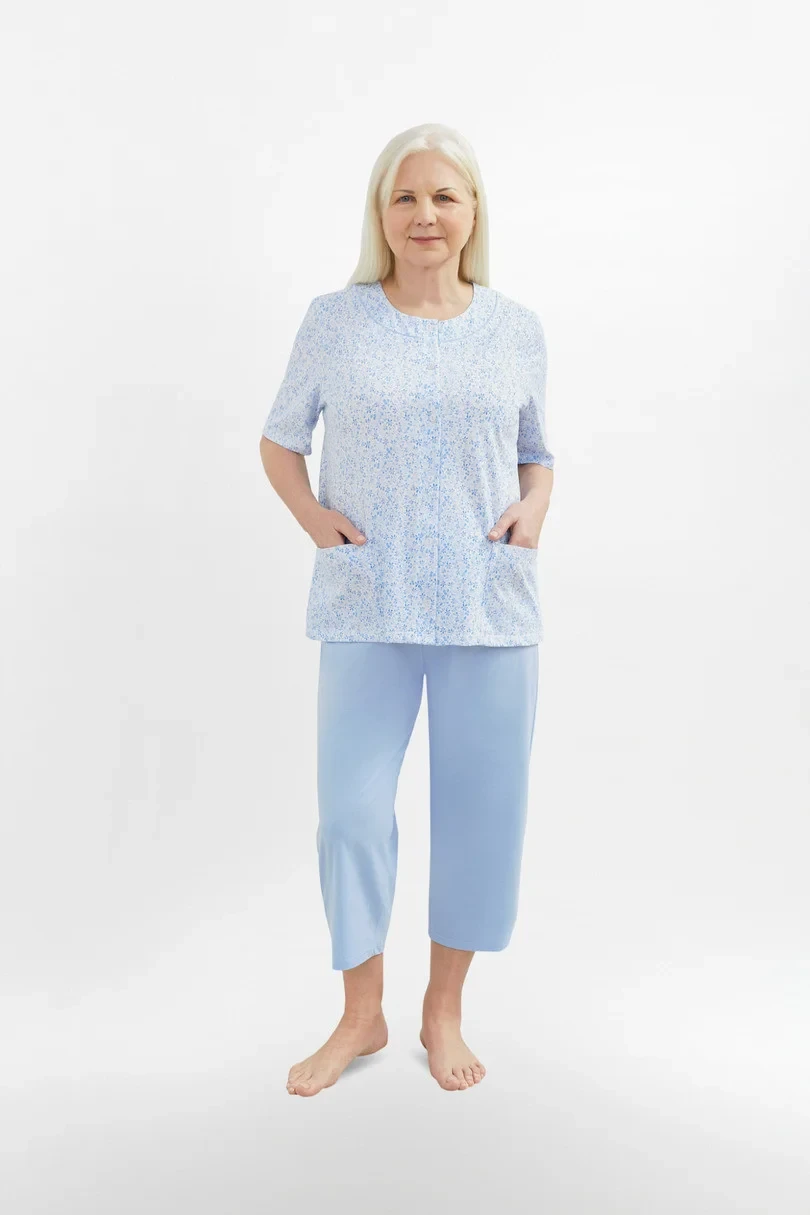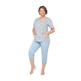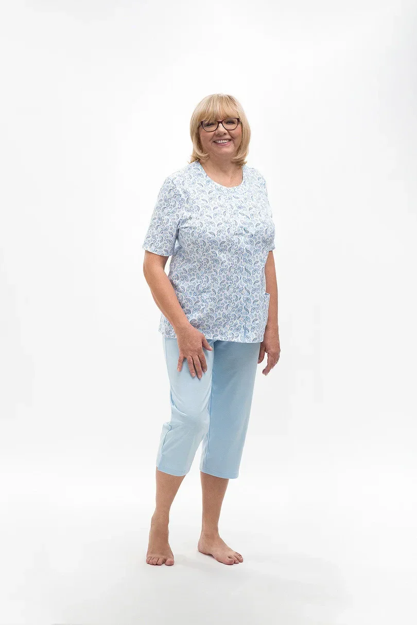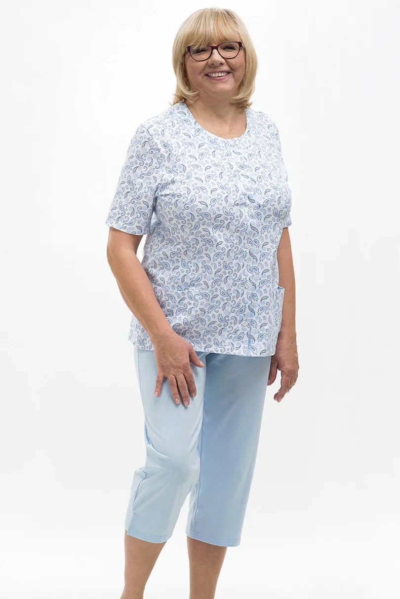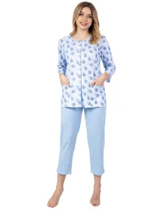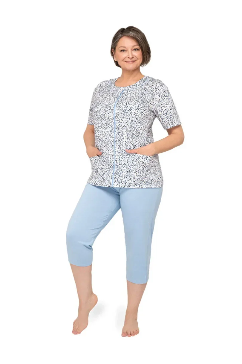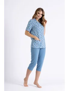 Dámské bavlněné pyžamo s kapsami a zapínáním na knoflíky. Kalhoty jsou hladké, v pase na gumu, v 3/4 délce.