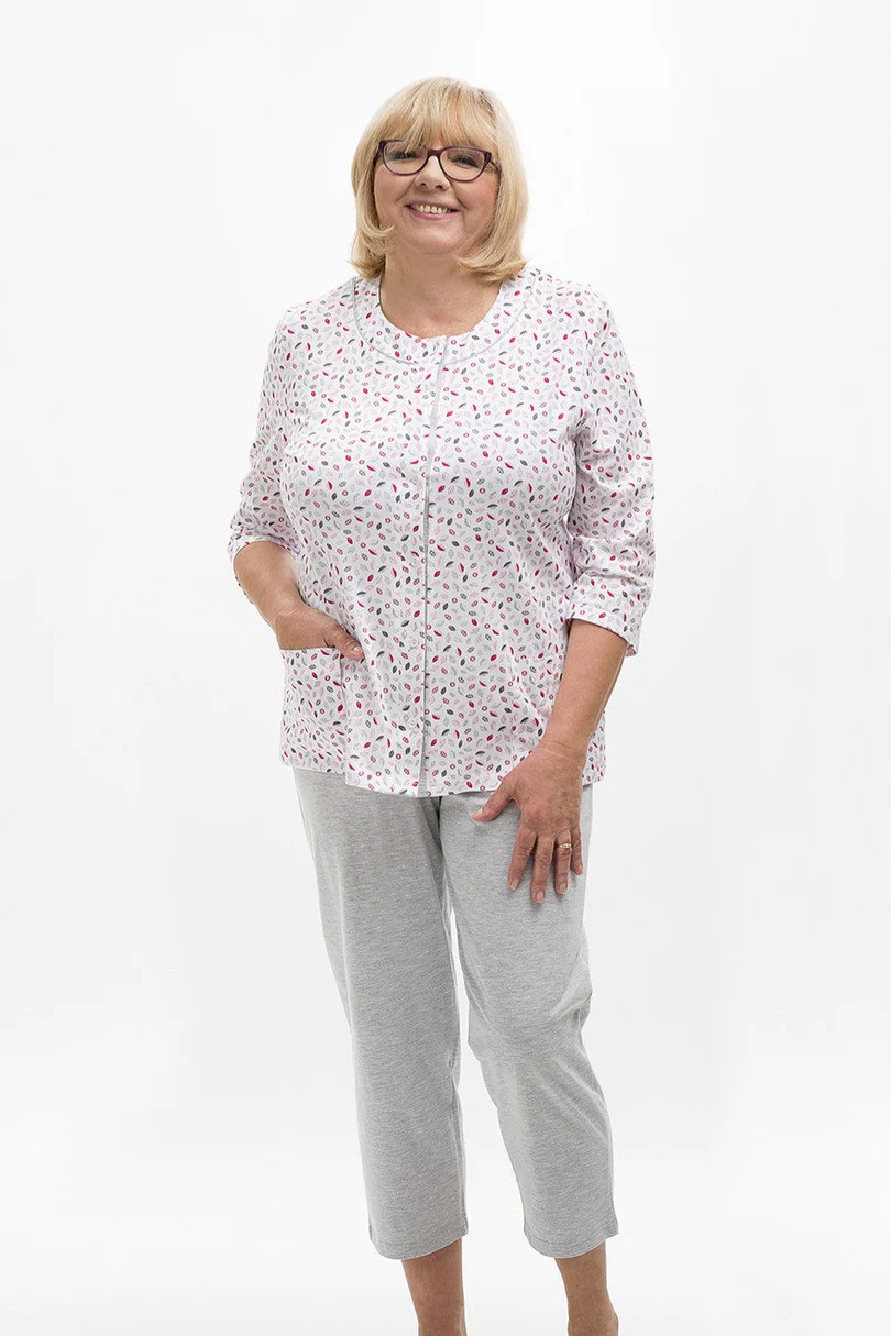 Blůza pyžama má 3/4 rukávy a je ozdobená květinovým vzorem. Půlkulatý výstřih se zapíná knoflíčky. Hladké kalhoty mají 3/4 délku. Střih a vzhled pyžama zachycují první tři fotografie.