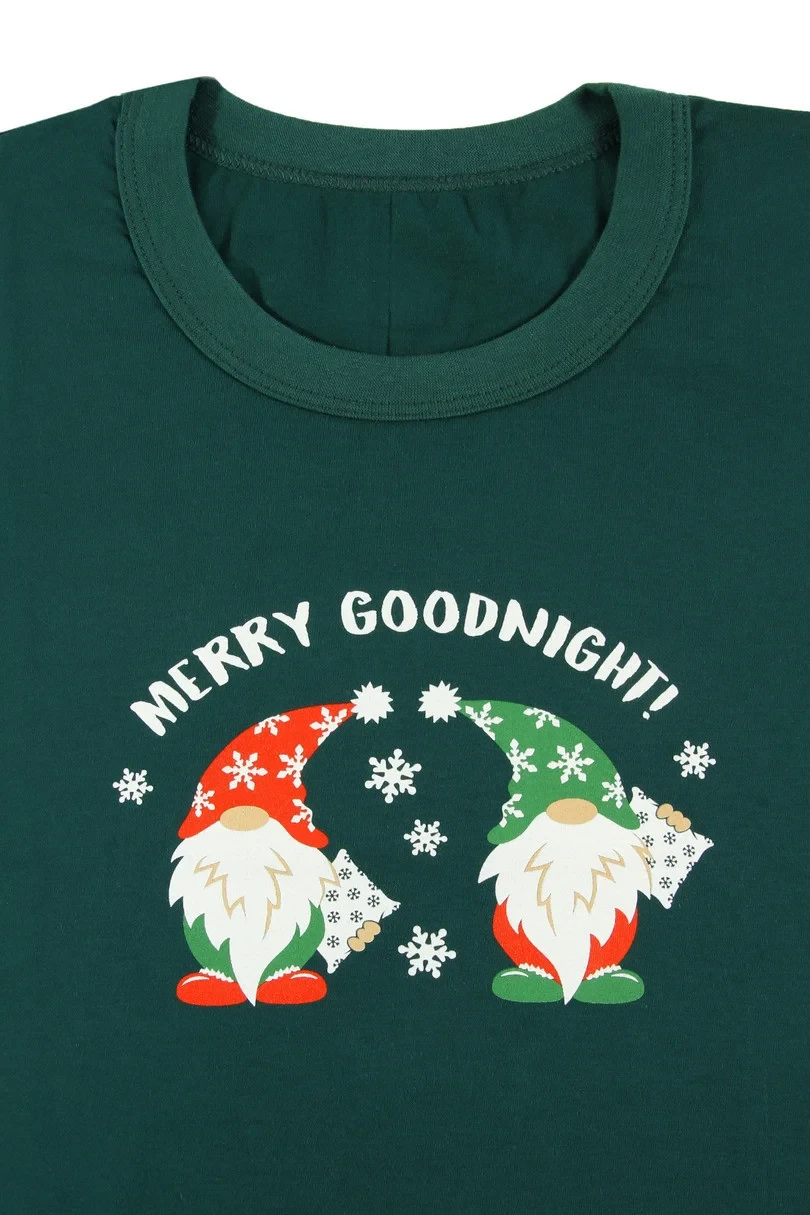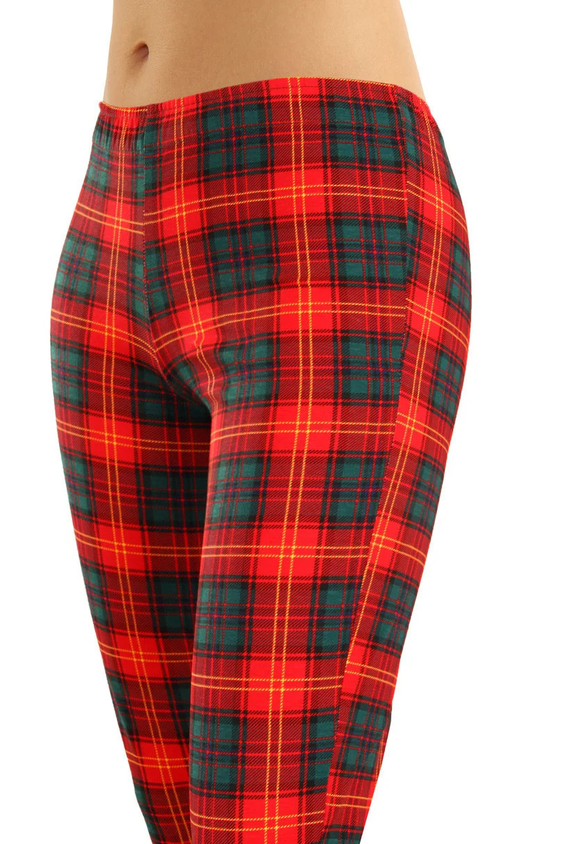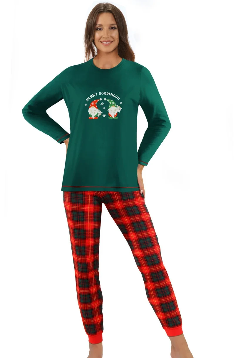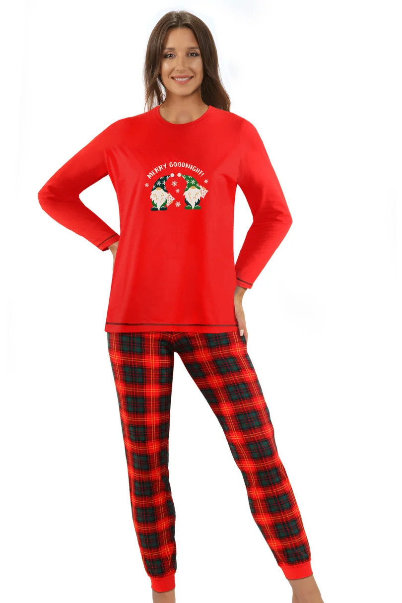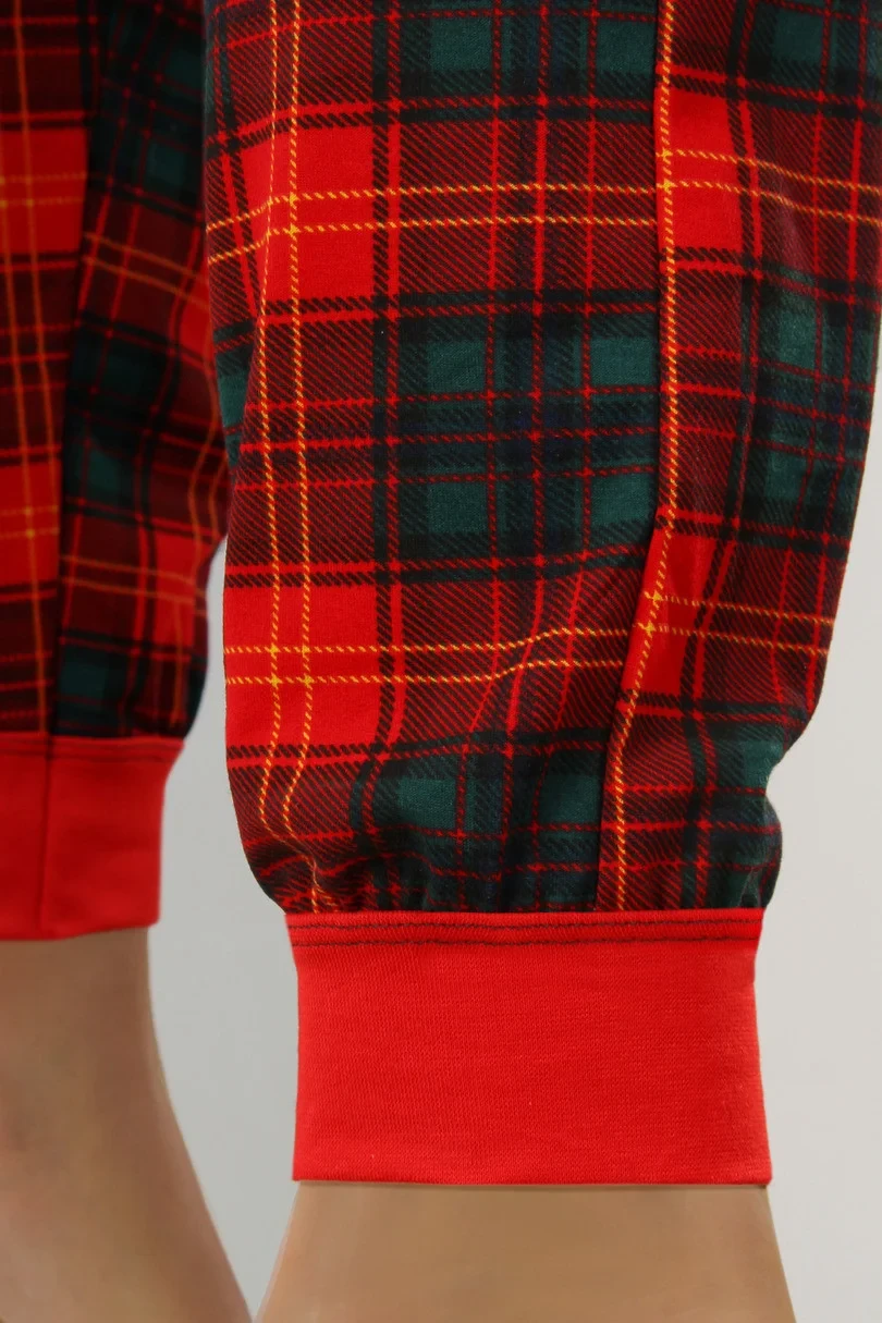 Blůza pyžama má dlouhé rukávy. Komplet doplňují dlouhé kárované kalhoty.
