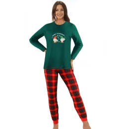 Blůza pyžama má dlouhé rukávy. Komplet doplňují dlouhé kárované kalhoty.