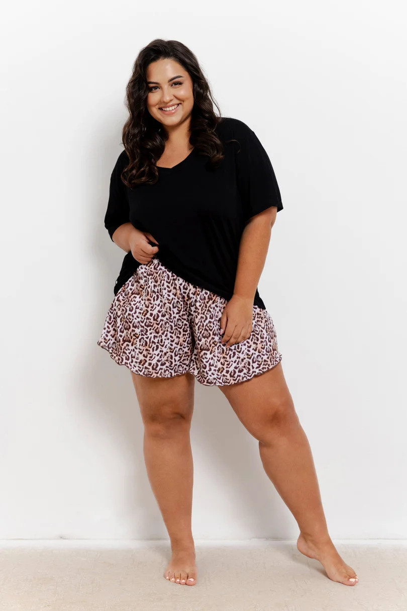 Dámské pyžamo s krátkým rukávem, jednobarevná halenka s výstřihem, krátké šortky s leopardím vzorem.