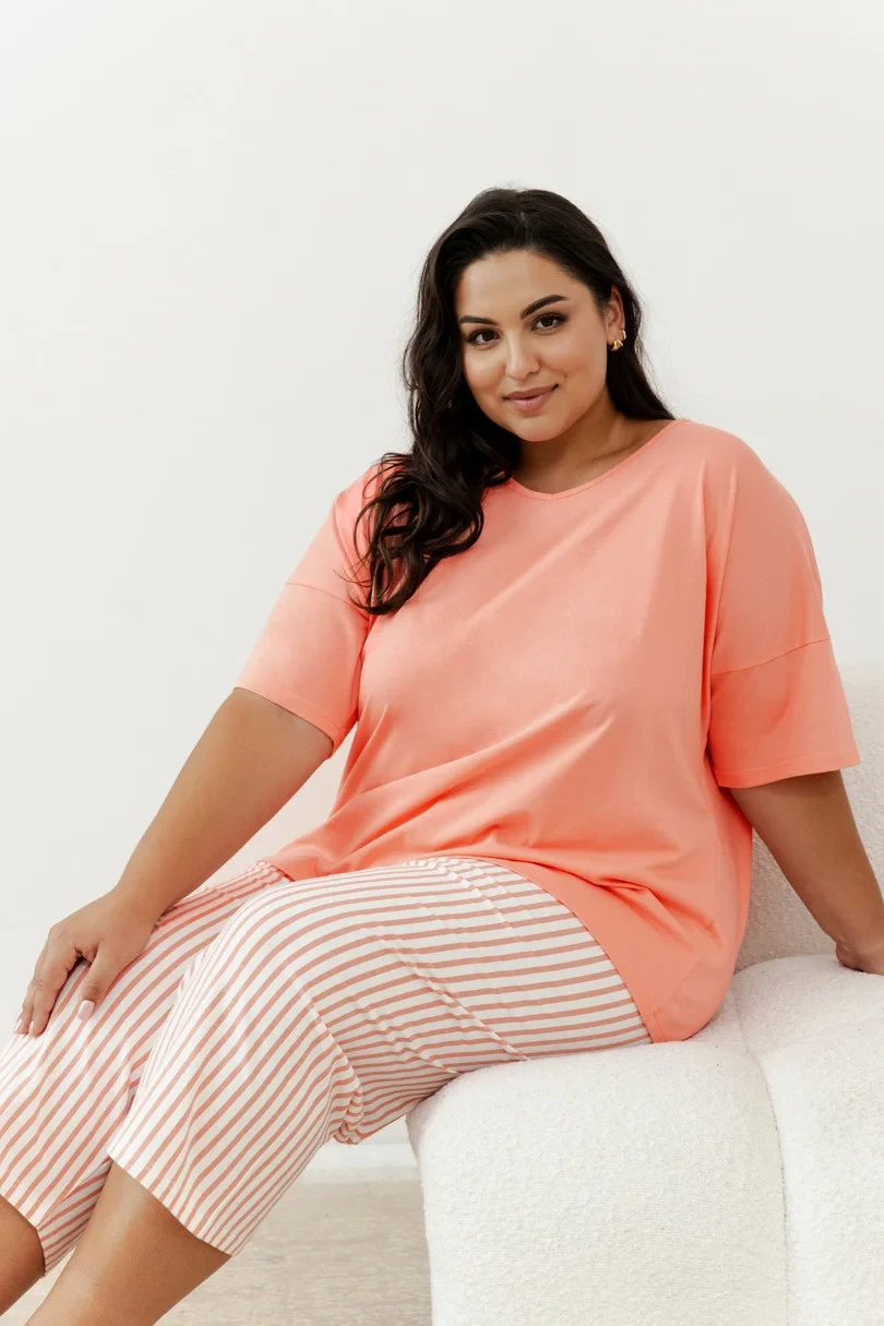Piżama damska 3375 Eloise marki Taro to idealny wybór dla kobiet ceniących komfort i styl. Wykonana w 100% z delikatnej bawełny, zapewnia przyjemne otulenie i przewiewność przez całą noc. Gładka bluzka z krótkim rękawem i dekoltem w serek nadaje subtelnej elegancji, a spodnie o długości 3/4 w paski dodają modnego akcentu. Doskonała na każdą porę roku, sprawdzi się zarówno do spania, jak i jako wygodny strój domowy.