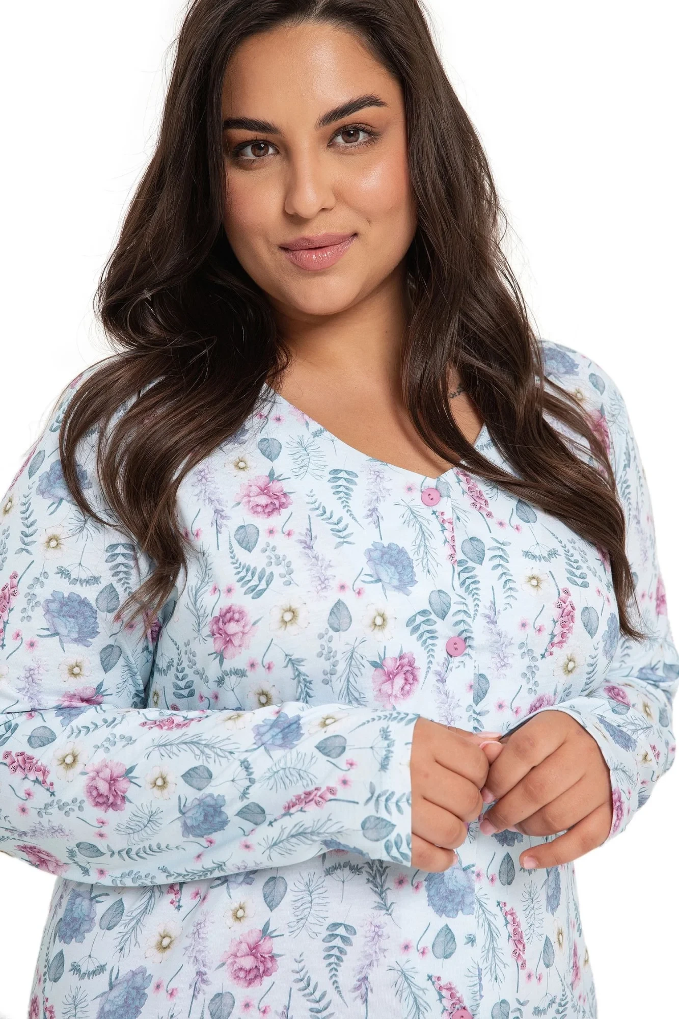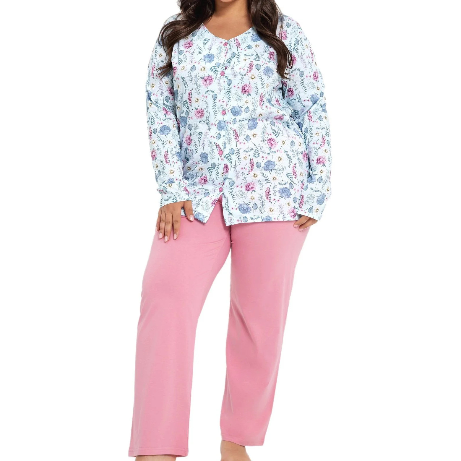 Dámské pyžamo 3009 Valencia TARO - bílá barva - z vysoce kvalitní a měkké bavlny - tričko bílé barvy s dlouhými rukávy - s květinovým motivem - zapínání na knoflíky - dlouhé kalhoty růžové barvy