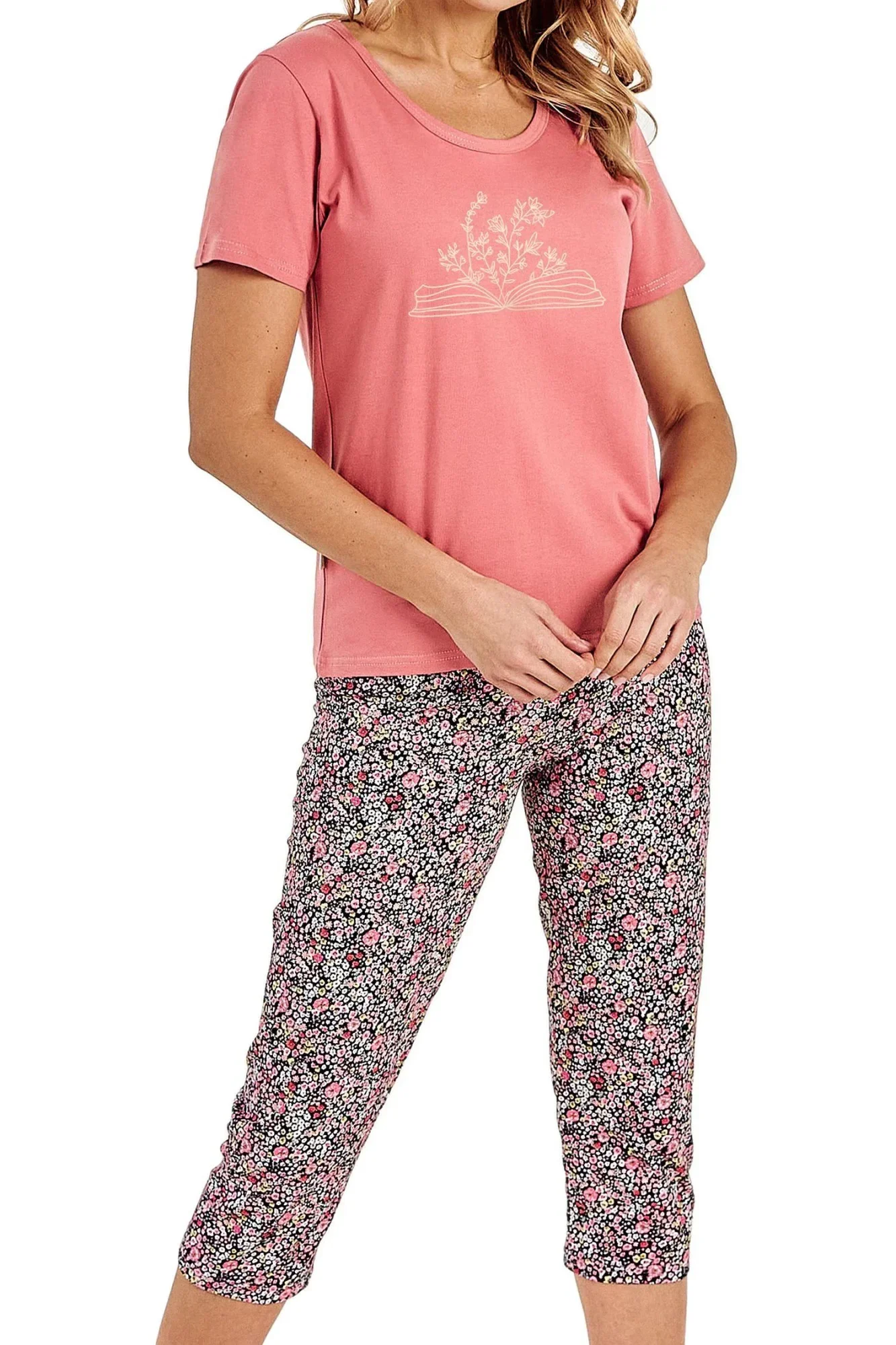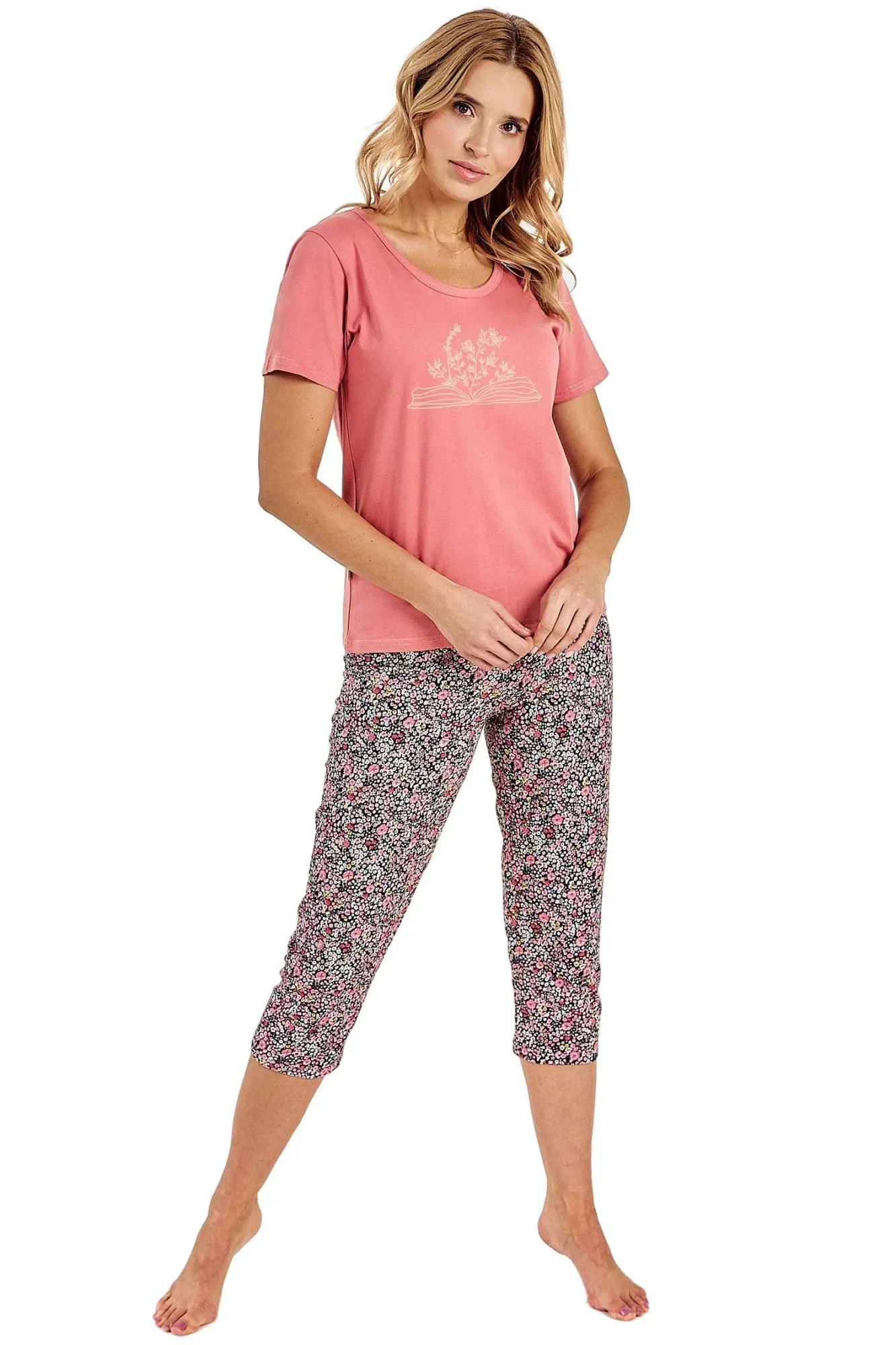 Dámské pyžamo 3095 Amara TARO - z vysoce jakostní bavlny - tričko je růžové barvy s krátkými rukávy - zdobené potiskem na přední straně - vzorované kalhoty