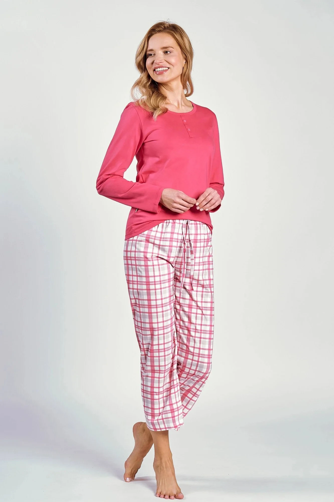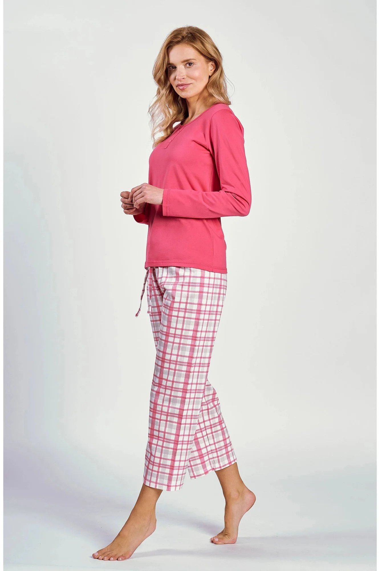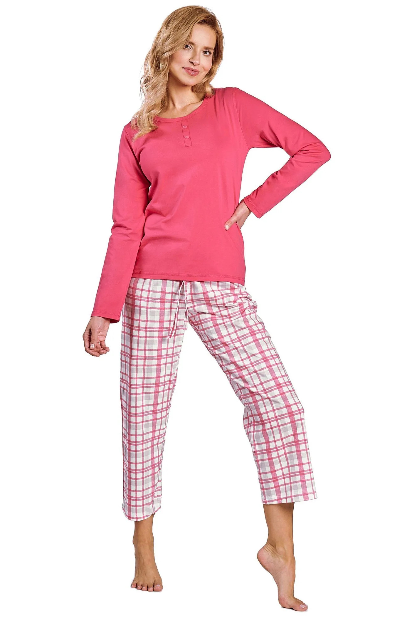 Dámské pyžamo 3222 Daphne TARO - z vysoce jakostní bavlny - tričko malinové barvy s tříčtvrtečními rukávy - výstřih se zapínáním na knoflíky - kárované kalhoty
