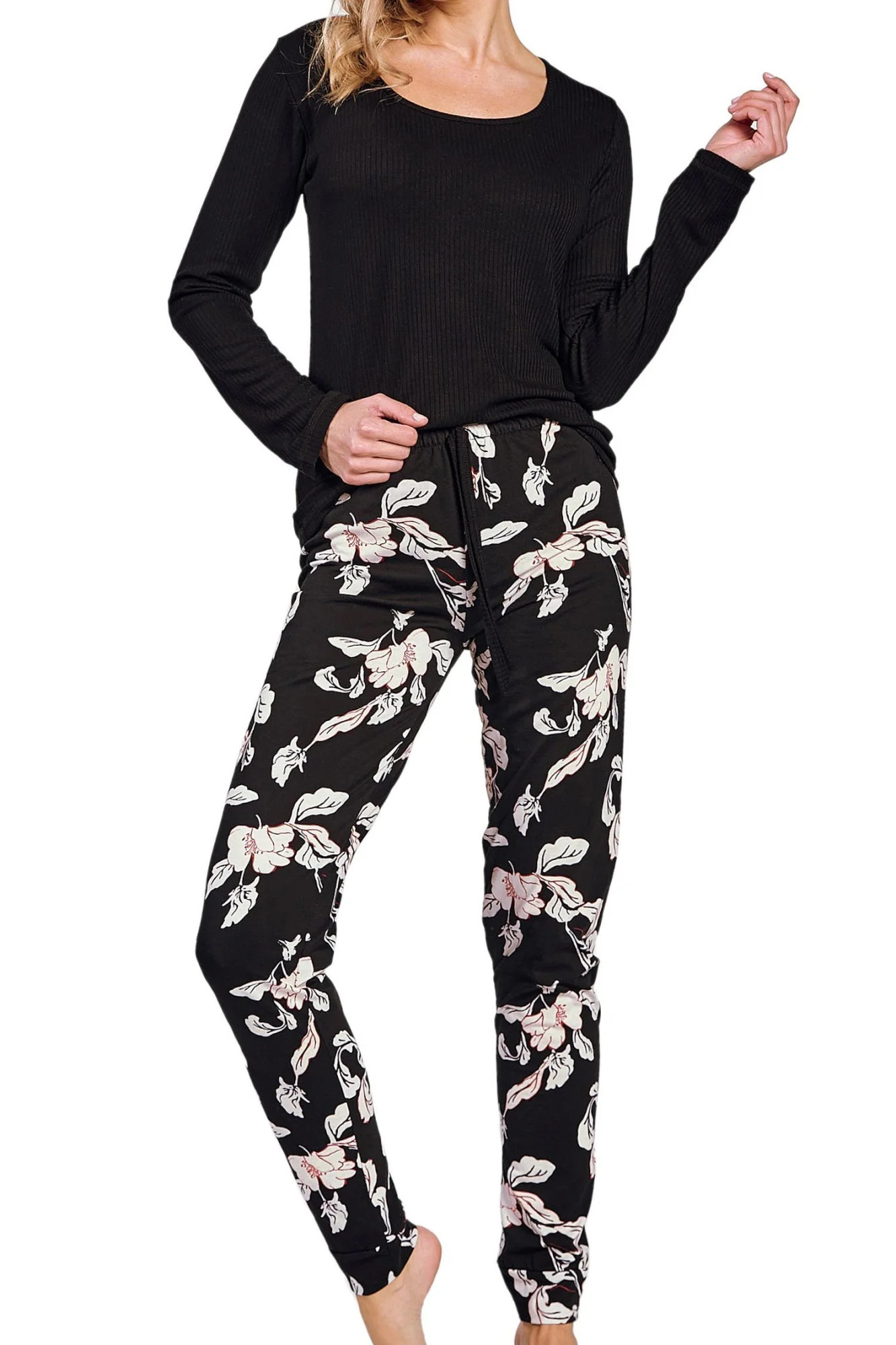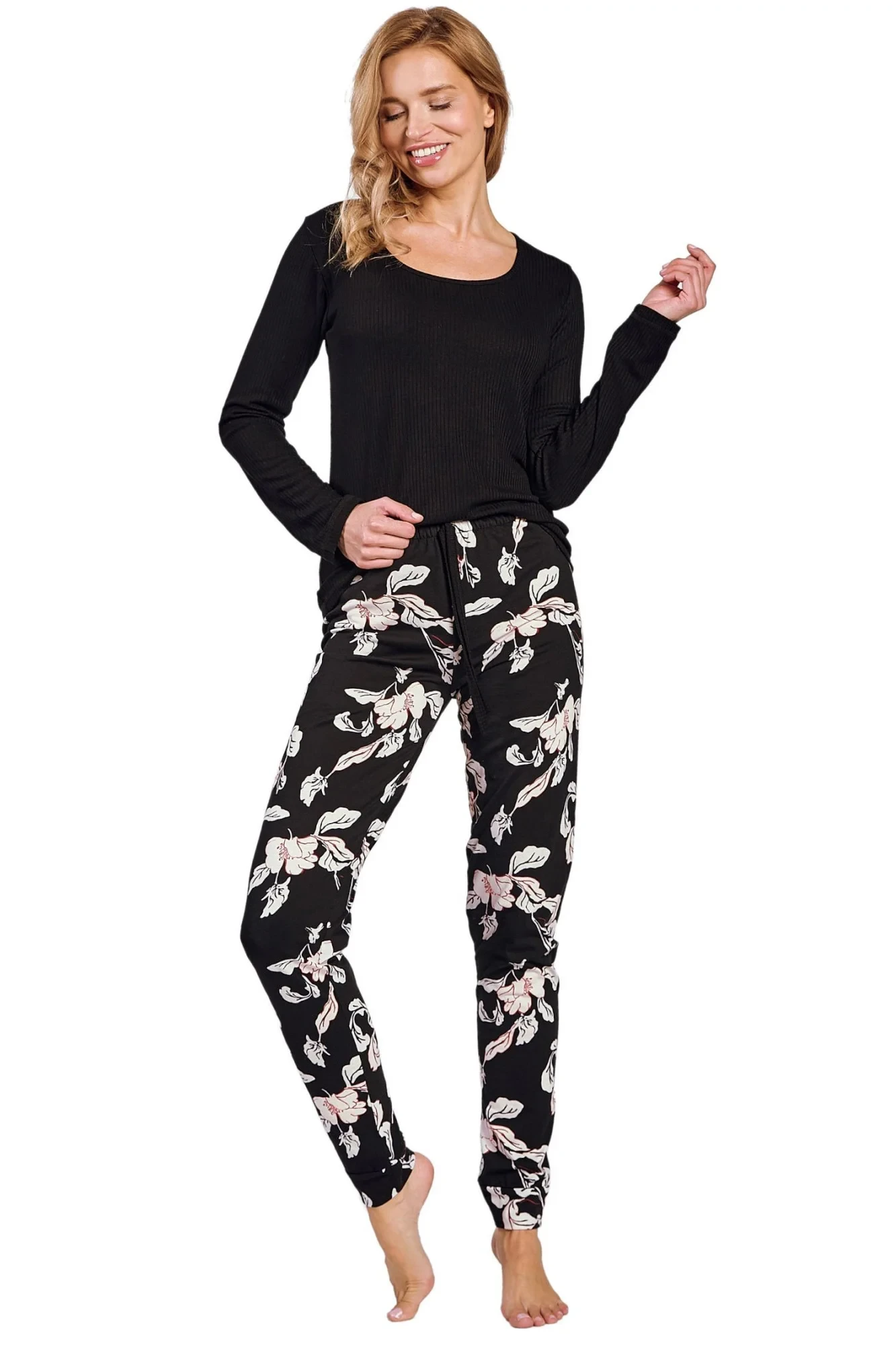 Dámské pyžamo 3232 Charlotte TARO - z vysoce jakostní žebrované viskózy - tričko černé barvy s dlouhými rukávy - půlkruhový výstřih - dlouhé vzorované kalhoty z bavlny - materiál kalhoty: 100% bavlna