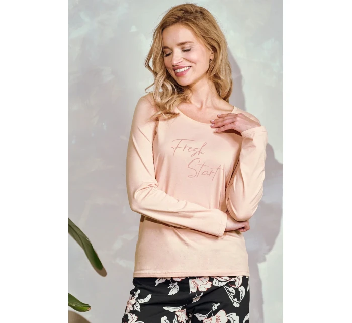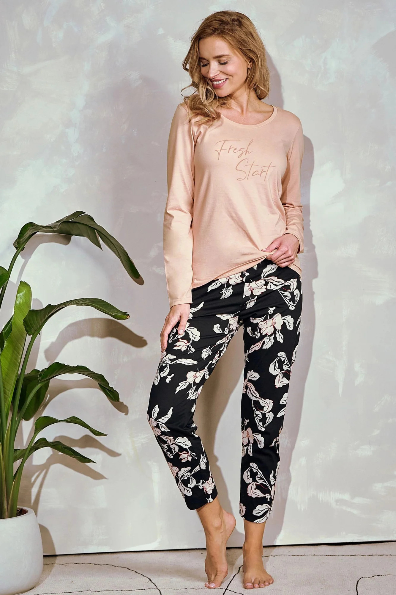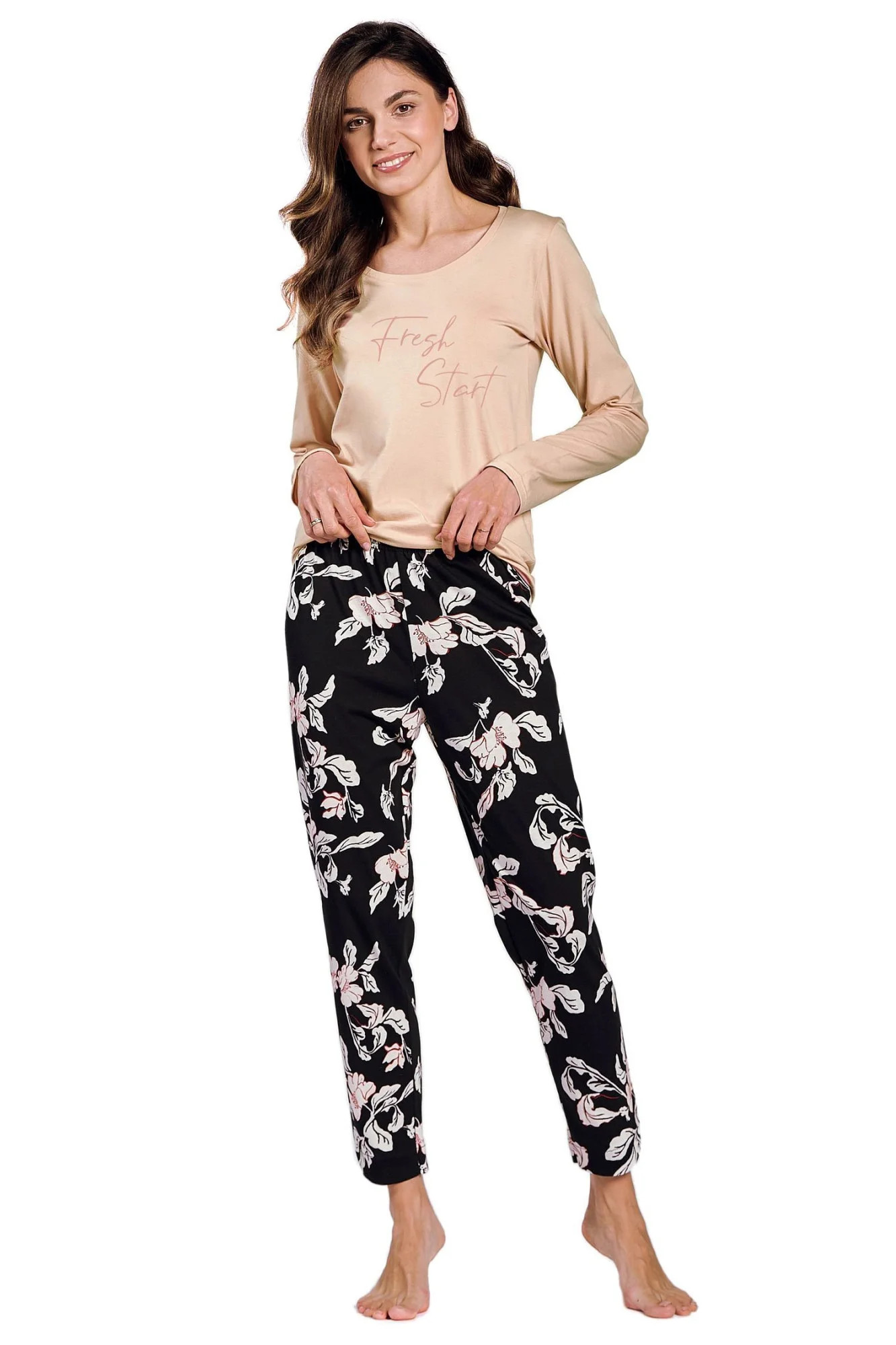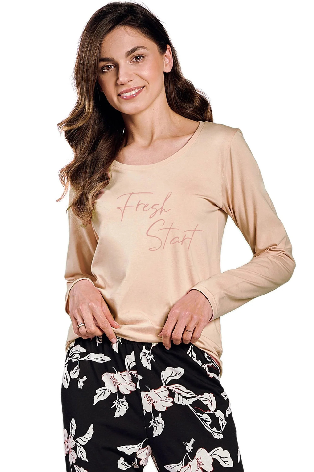 Dámské pyžamo 3234 Katie TARO - z vysoce jakostní bavlny - tričko béžové barvy s dlouhými rukávy - na přední straně zdobené potiskem - vzorované kalhoty