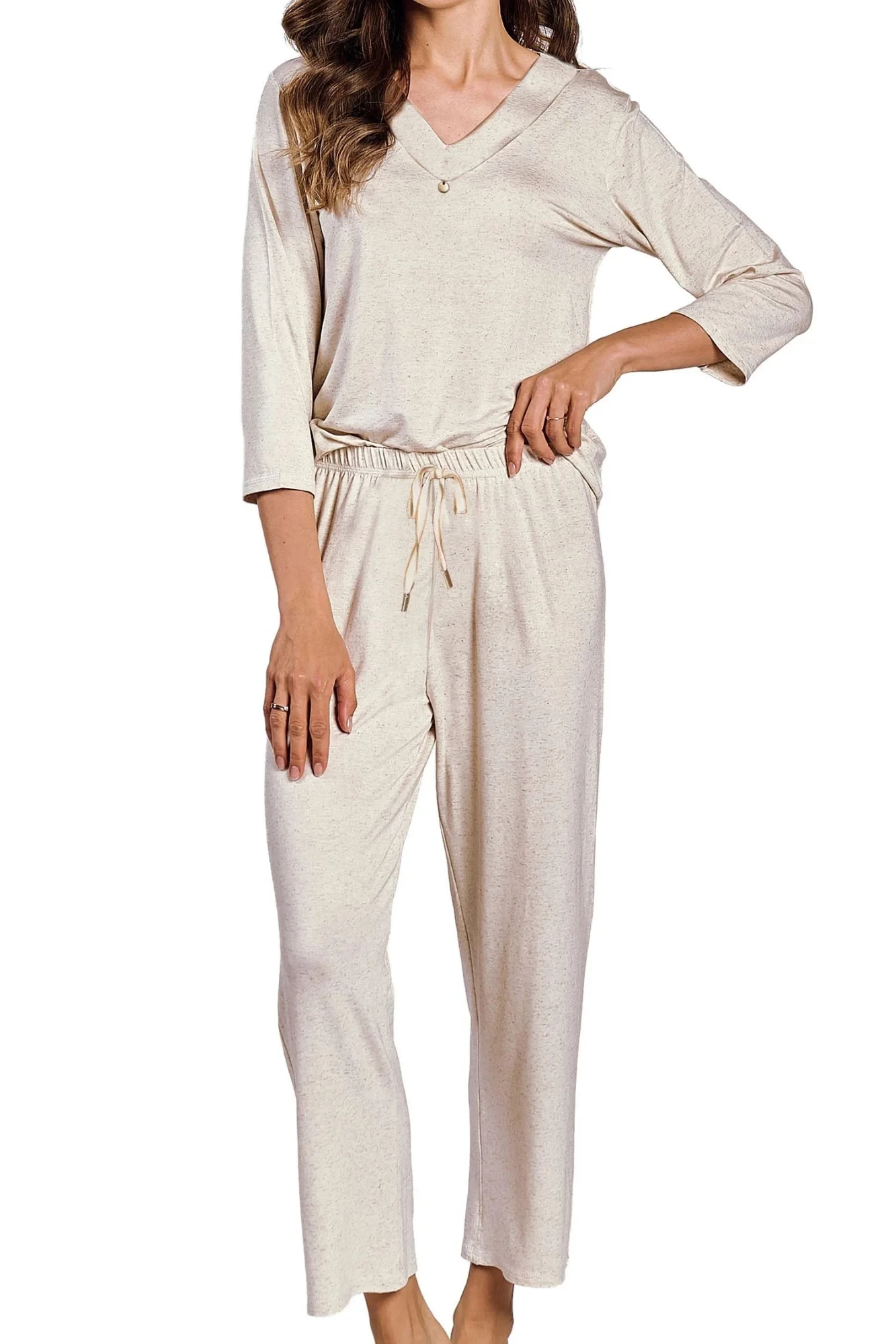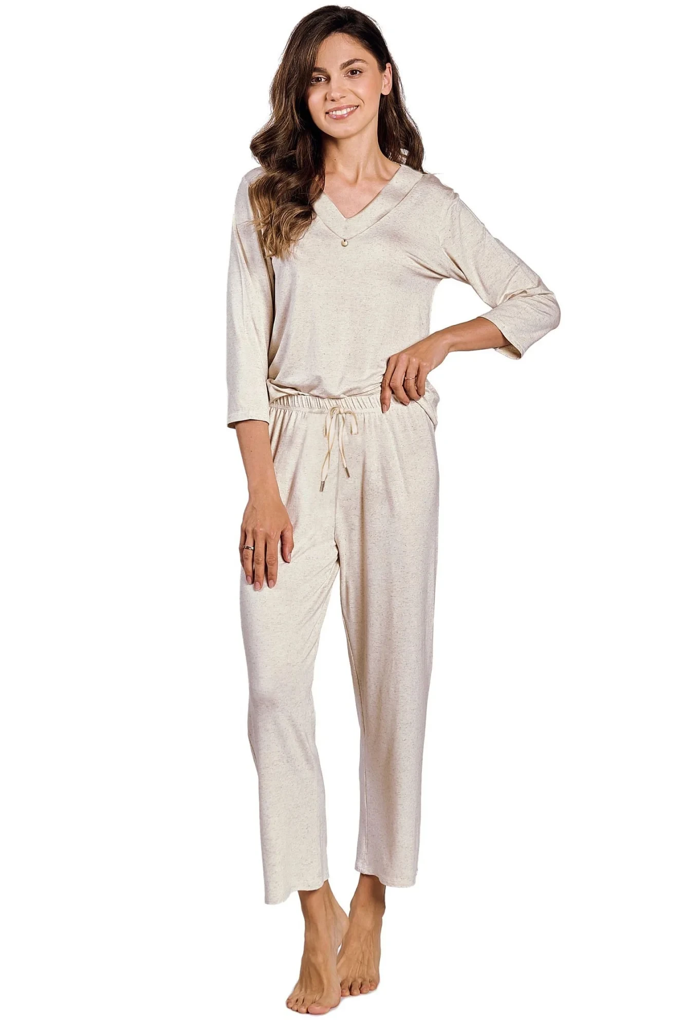 Dámské pyžamo 3245 Haria TARO - z vysoce jakostní viskózy a lnu - tričko béžové barvy s tříčtvrtečními rukávy - dlouhé kalhoty béžové barvy - zavazování v pase