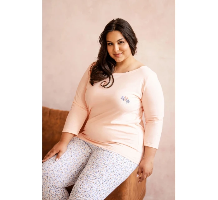 Dámské pyžamo 3257 Ariella peach TARO - z vysoce jakostní bavlny - tričko lososové barvy s tříčtvrtečními rukávy - na přední straně zdobené potiskem - vzorované kalhoty