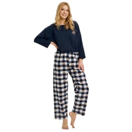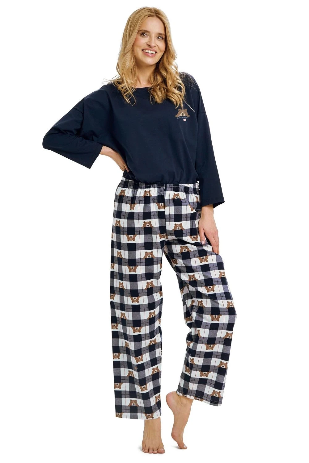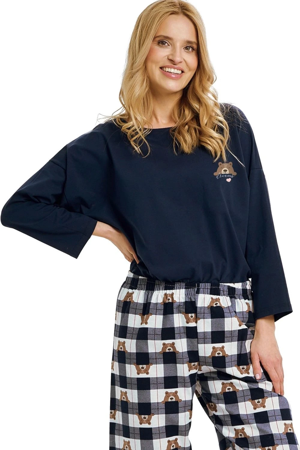 Dámské pyžamo 3441 01 Astrid TARO - z vysoce jakostní bavlny - tmavě modré tričko s dlouhými rukávy - kulatý výstřih - zdobené potiskem na přední straně - dlouhé volné nohavice s potiskem